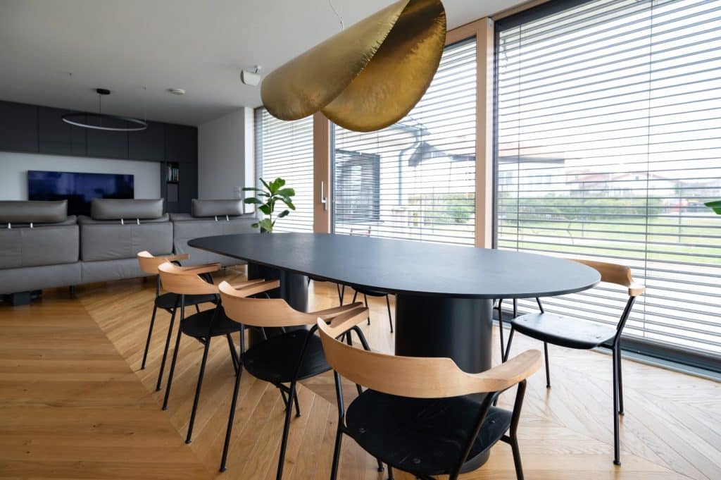 Prepričljivo toplino v prostore vnese oljen hrastov parket, ki je položen v ribjo kost. Pestrost v interier pa dodajo zanimiva viseča svetila na stropu in svetila, ki so subtilno integrirana v pohištvo. Ta ob temnejših delih dneva z indirektno osvetlitvijo poskrbijo za posebno atmosfero.