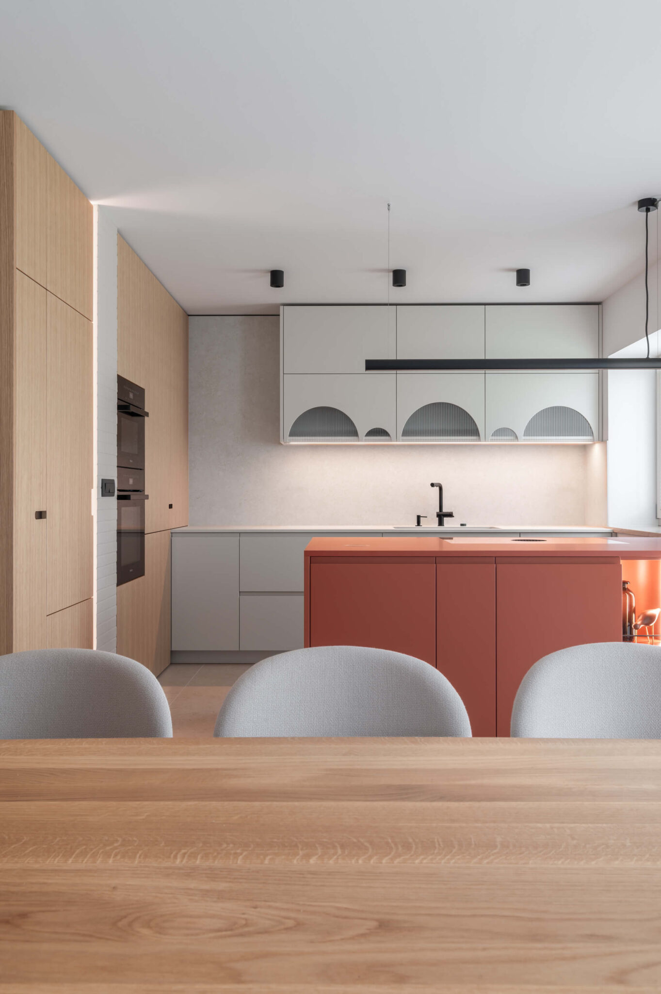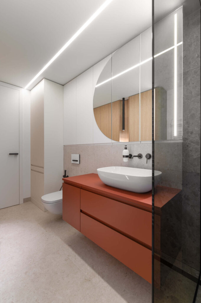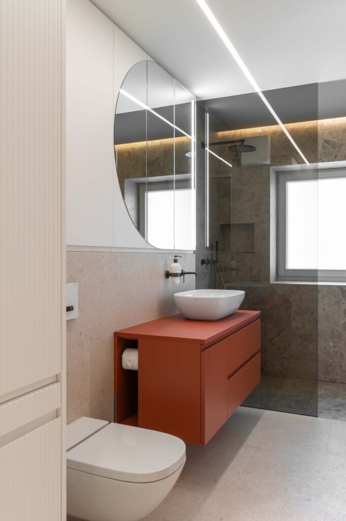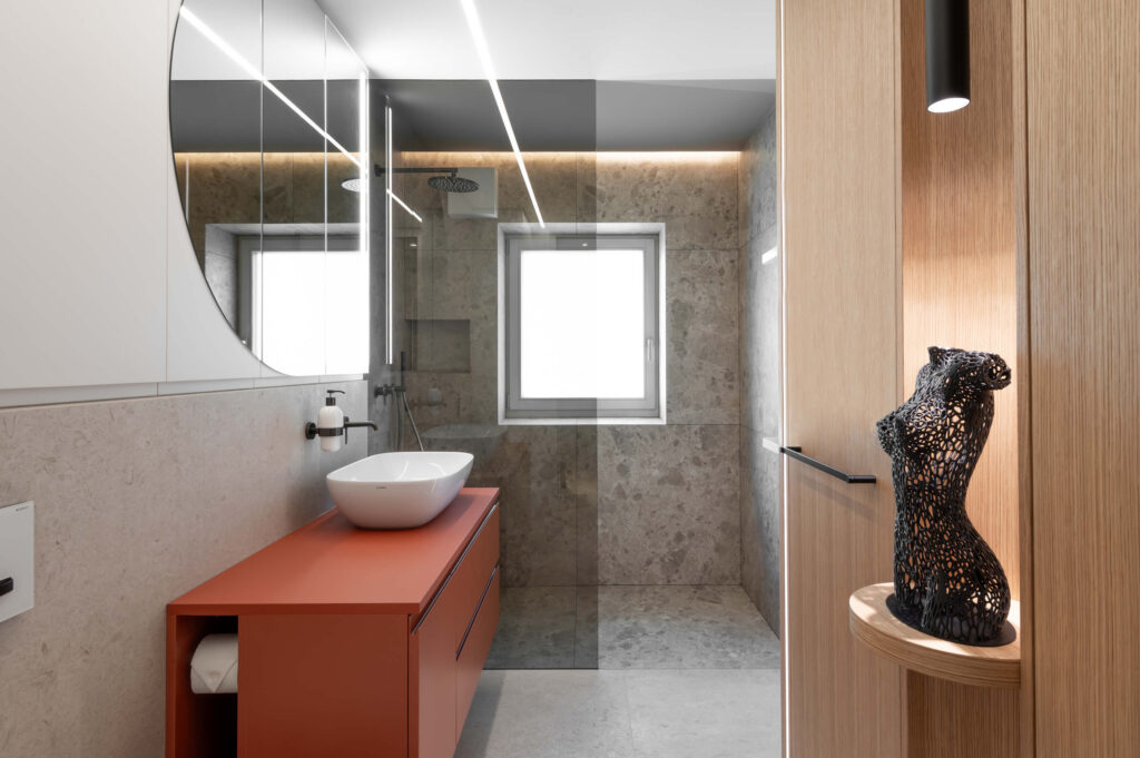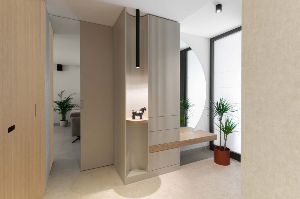 Zaradi doslednega sledenja proporcem in premišljeno usklajenih detajlov interjer ne deluje vizualno nasičen, temveč skladen, pomirjujoč. Vertikalna tekstura se kot prepoznavna rdeča nit pojavlja v vseh prostorih, občasno prekinjena z mehko polkrožnimi izseki, ki se pojavljajo kot izdolbine za osvetljene predmete, kot zasteklitve omar ali kot ogledalne površine.