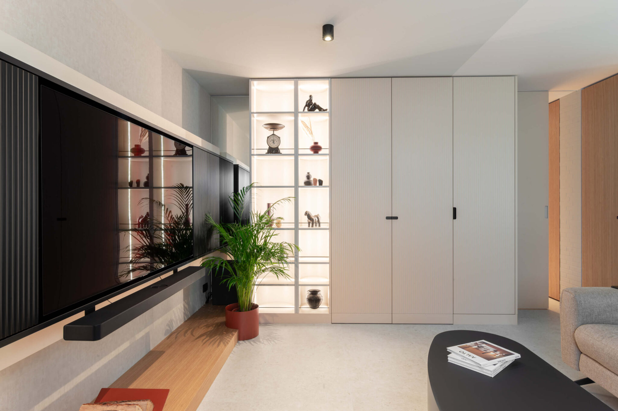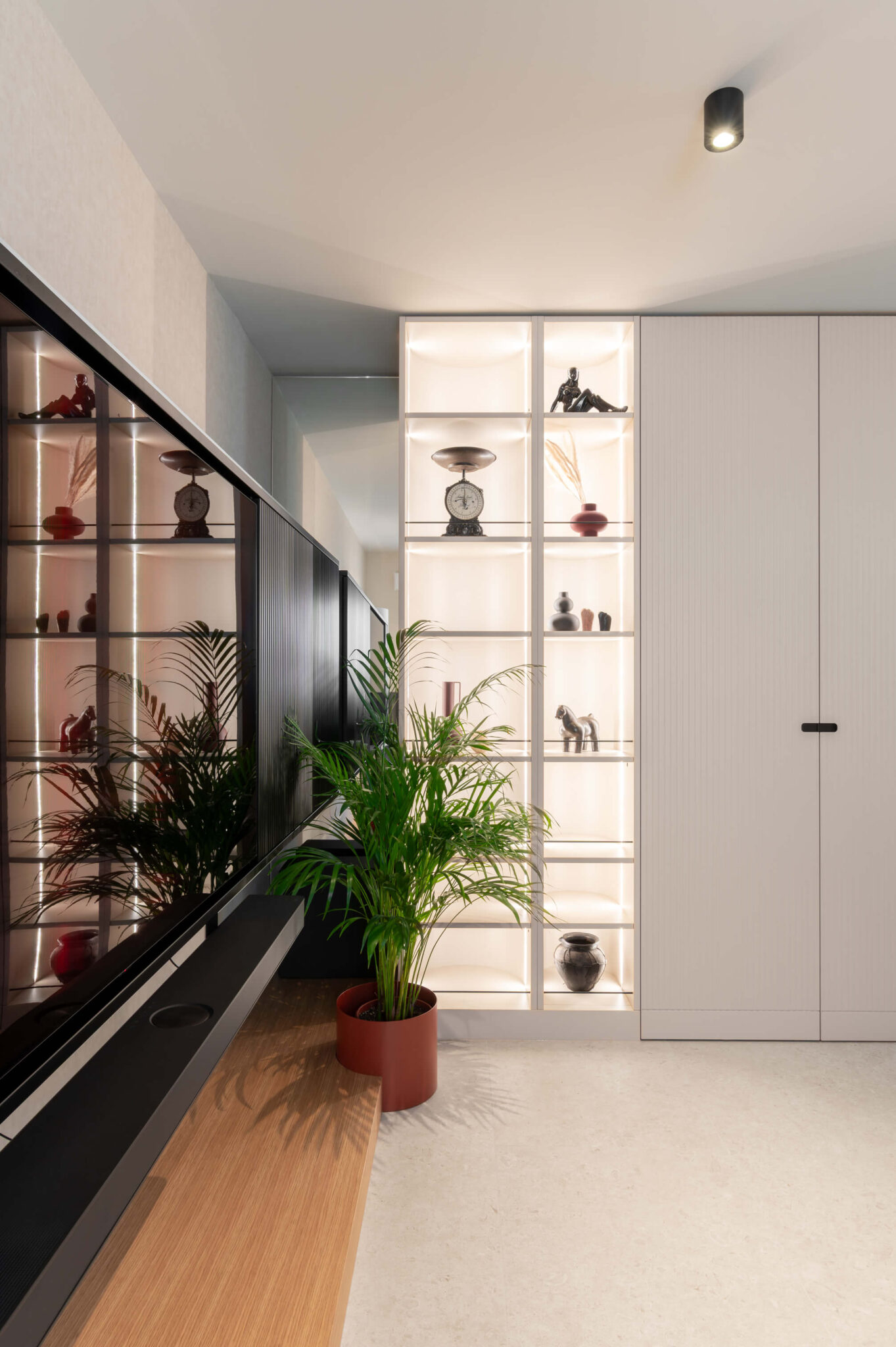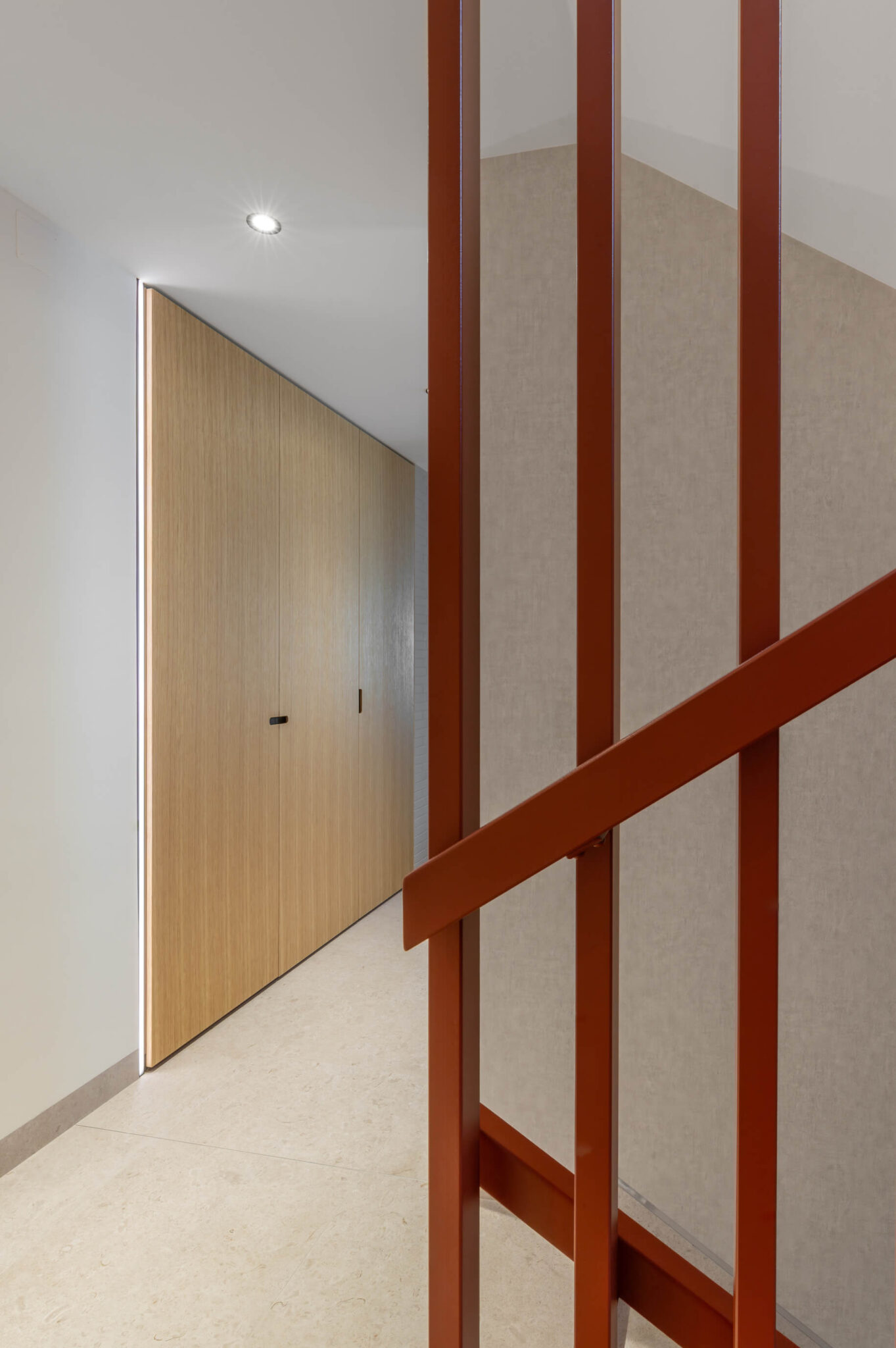 Zaradi doslednega sledenja proporcem in premišljeno usklajenih detajlov interjer ne deluje vizualno nasičen, temveč skladen, pomirjujoč. Vertikalna tekstura se kot prepoznavna rdeča nit pojavlja v vseh prostorih, občasno prekinjena z mehko polkrožnimi izseki, ki se pojavljajo kot izdolbine za osvetljene predmete, kot zasteklitve omar ali kot ogledalne površine.