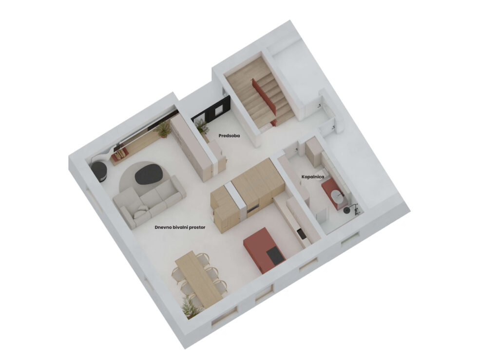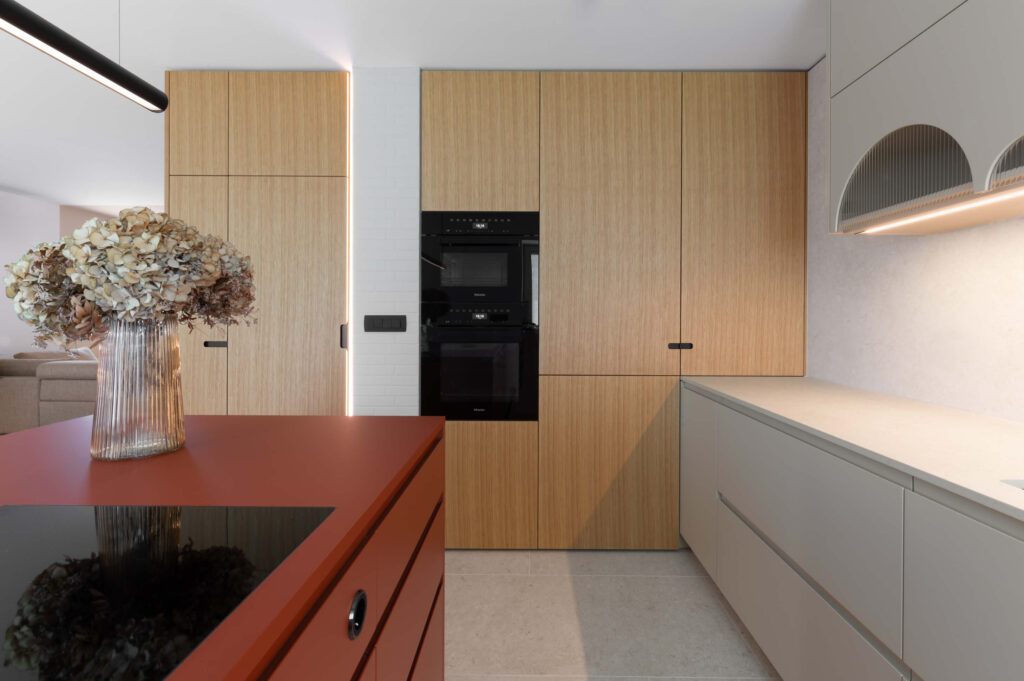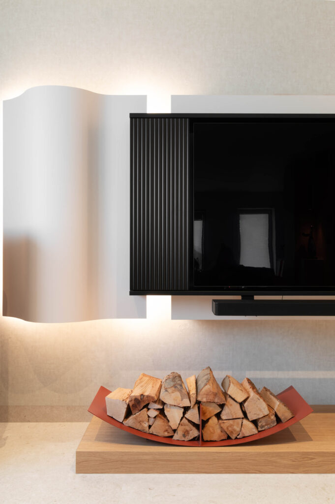 Kljub sodobni preobrazbi pa je interjer ohranil svojo prvotno vizijo, ki pripoveduje zgodbo o ročnem znanju in potrpežljivosti, z uporabo bogatih tekstur in natančno mizarsko obdelavo. Med unikatnimi detajli izstopajo polkrožne niše s policami in svetlobnimi poudarki, stojalo za drva s svojo utilitarno eleganco, živahni ritmi ročajev, terakotni poudarki ter skrbno uravnotežene kompozicije volumnov in praznin.