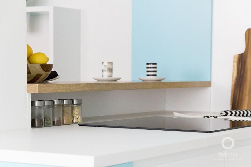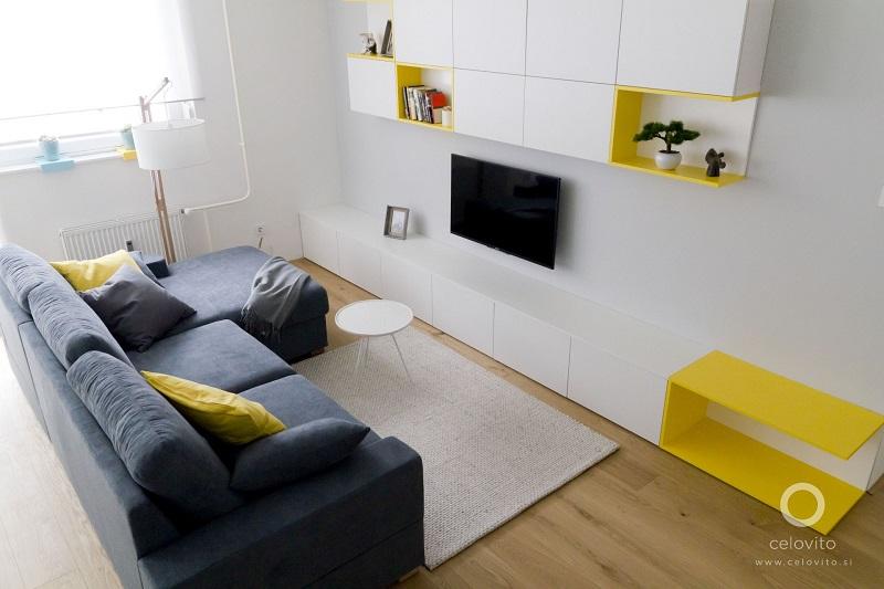 Izbrane barve, ki izhajajo iz fototapete, pa so rdeča nit celotnega stanovanja, saj si je lastnica zaželela barvit in ženstven dom. Arhitekti so zato preprosto belo pohištvo poživili z barvnimi in lesenimi elementi ter pisanimi dodatki za dom: med njimi so tudi po meri narejeni priročni podstavki za cvetlične lončke. Nekateri kosi pohištva so bili izdelani po meri, medtem ko so drugi zgolj osveženi: sedežna garnitura je na primer dobila zgolj novo podnožje, ki se bolj sklada s celoto. Prav ti poudarki pa stanovanju dodajo piko na i.