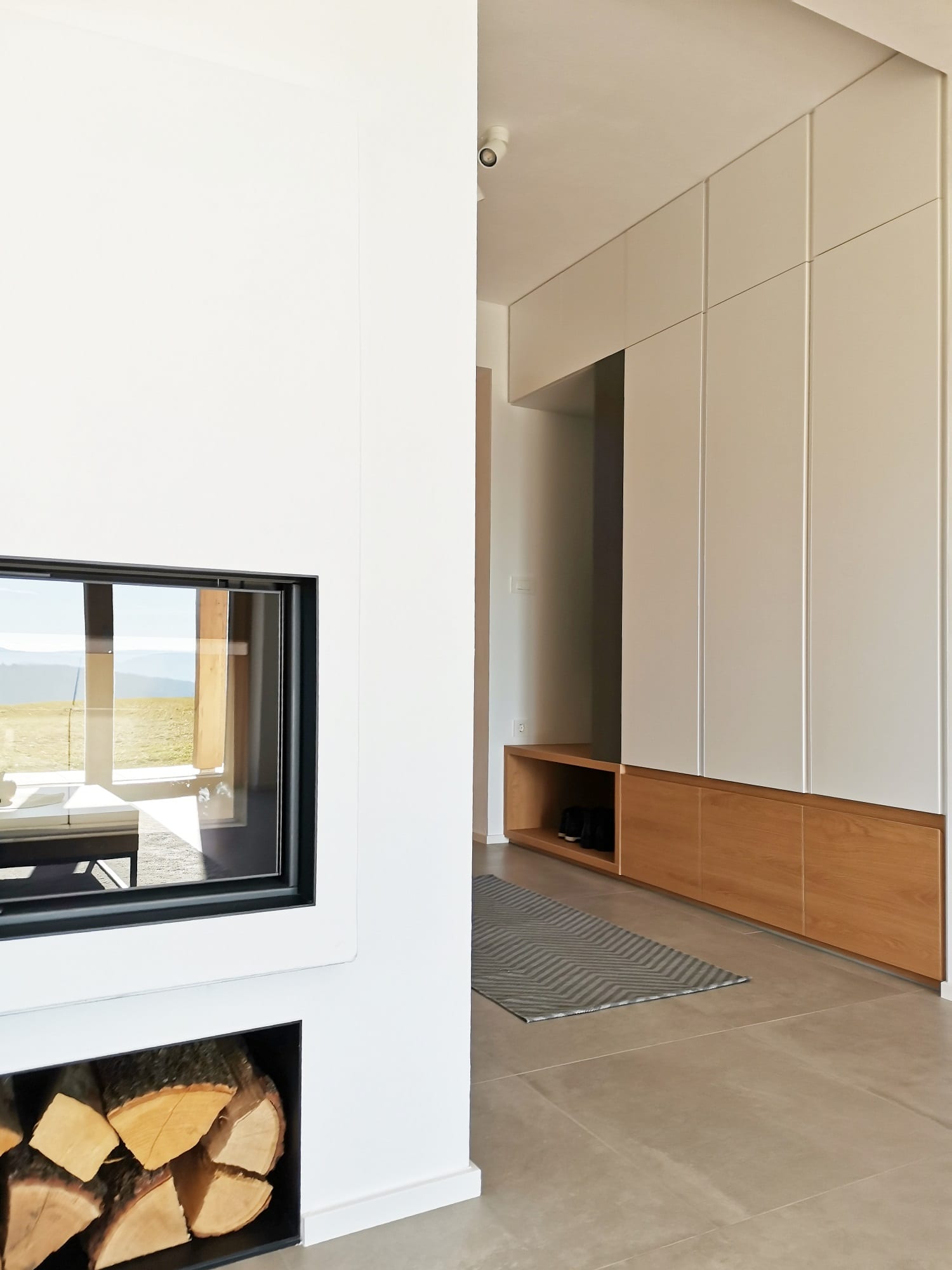 Eden od glavnih poudarkov je gotovo jedro hiše s stopniščem. Slednje je spiralno zavito in z vseh strani dobro izkoriščeno: z ene strani ga objema kuhinja, z druge kamin, s tretje pa velike izvlečne omare, del vhodne garderobe. “Naročnika sta želela izčiščene linije, zato fronte nimajo ročajev – z izjemo omare pod stopnicami, ki ima težke izvlečne predale, s katerimi smo do zadnjega kotička izkoristili prostornino; tu so bili ročaji nujni,” pove arhitektka. Posebna je tudi funkcionalnost dnevne sobe: okoli sedežne garniture sta arhitektki zasnovali nizke police, ki služijo kot dodaten shranjevalni element, kot odlagalna površina oziroma kot mejnik v prostoru.