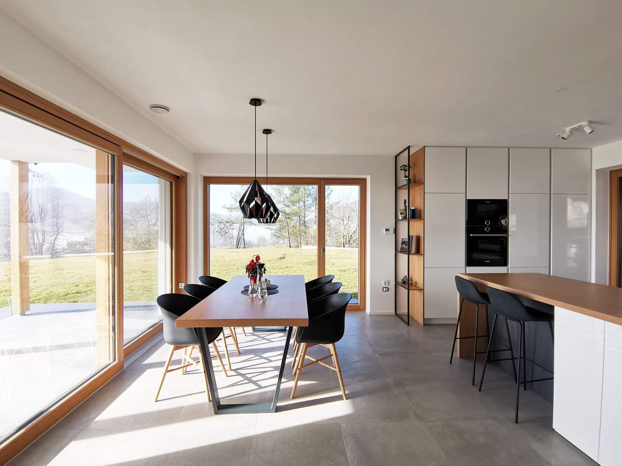 Kot vodilo sta si zadali ustvariti čim bolj zračen in odprt prostor, ki z opremo ne zastira pogledov na okolico. Ker investitorja veliko časa preživita zunaj, je bila po celotnem pritličju položena keramika v elegantnem sivem odtenku. Le-tej sta prilagodili tudi ostale materiale. “Naročnika si nista želela barv, zato smo celoten interier zasnovali v naravnih tonih, kjer prevladuje hrastov les, bela, imitacija betona in antracitni kovinski detajli. Veliko smo se posvečali kombiniranju materialov in barv ter detajlom.”