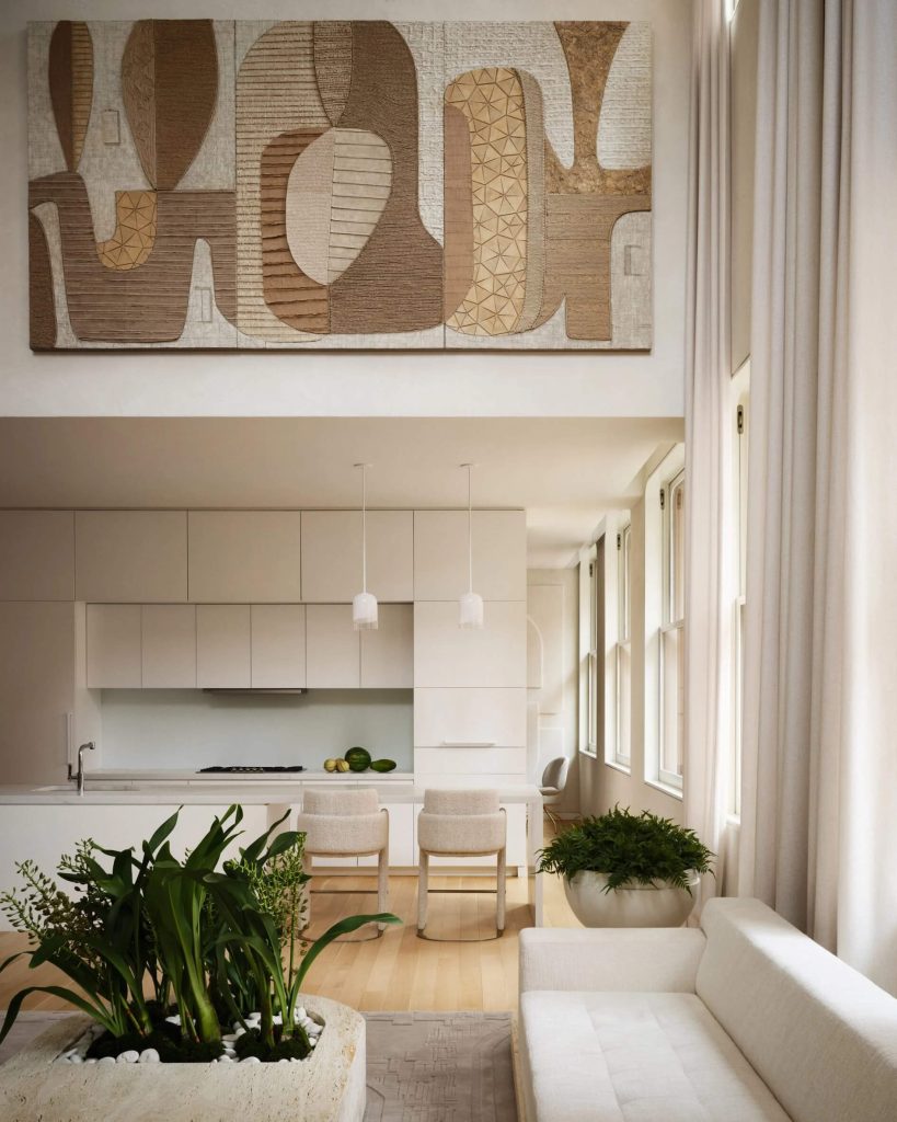Nevtralna paleta barv bi lahko pri manj spretnih oblikovalcih delovala monotono, dolgočasno, kar bi bilo daleč od zastavljenih ciljev po zabave polnem domu. Tlorisna postavitev in umestitev pohištva tako omogočata prostor za udobno družinsko življenje, z obsegom pohištva in umetniškimi deli pa je oblikovalec prostoru vdahnil nekaj dramatičnosti.