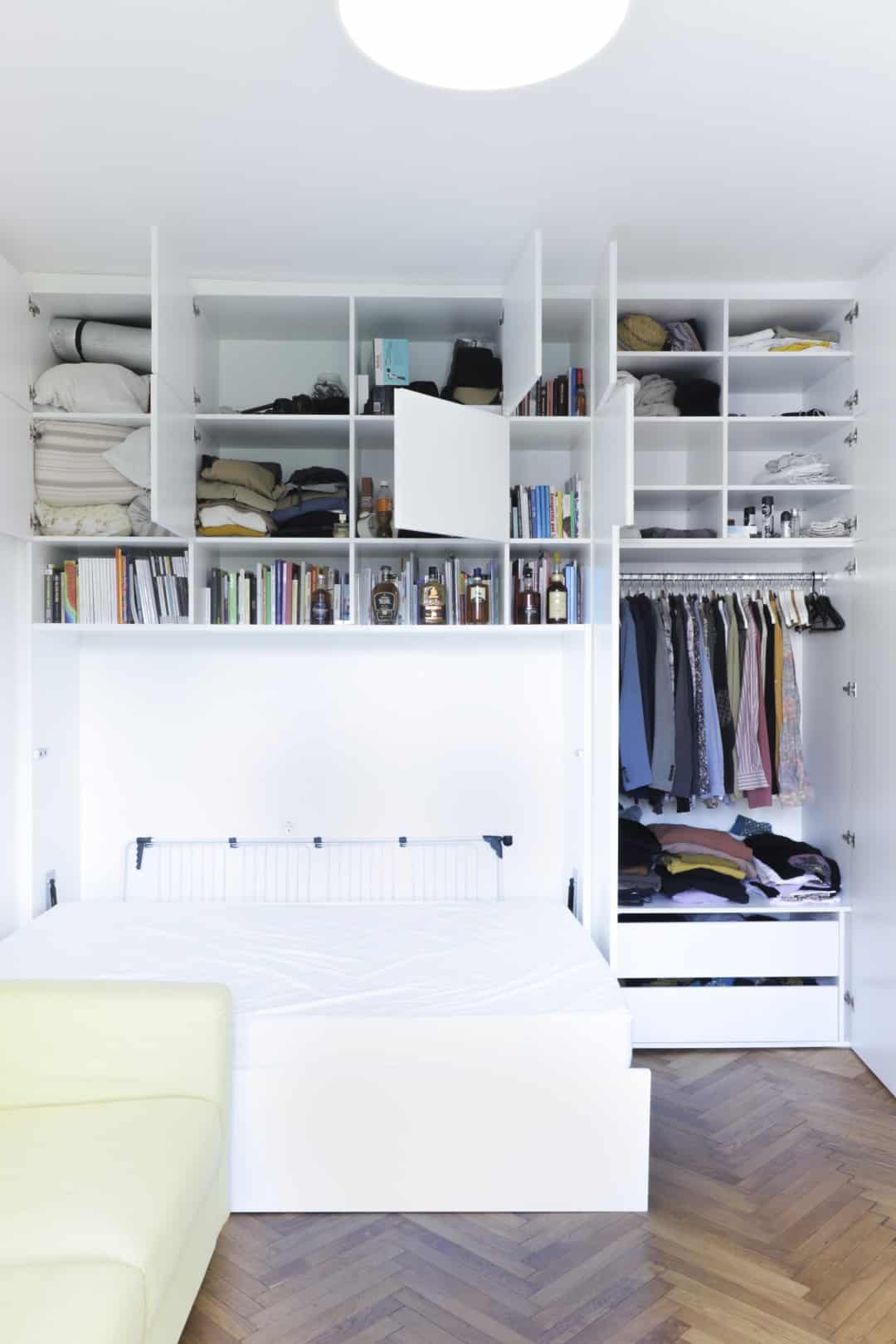 Z več funkcijami v mislih sta lastnika uredila tudi spalni kotiček. Podnevi se lahko postelja namreč zloži v omaro in tako sprosti dragoceni prostor, v omari pa je tudi več kot dovolj prostora za vso garderobo in osebne predmete para.