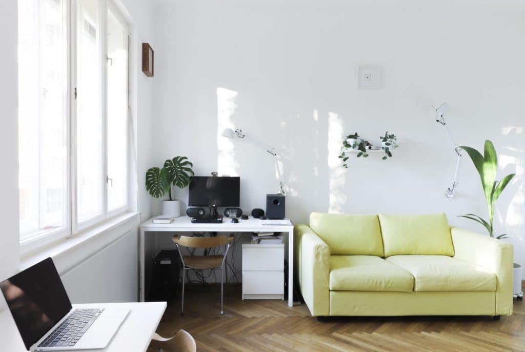 V sobi sta še dodatni konzolni mizi – za večja druženja ali delovno površino -, ki se lahko zložita ob steno, ko nista v uporabi. Vse pohištvo je izdelano po meri tako, da kar najbolje izkoristi prostor, hkrati pa se zaradi svojega minimalističnega oblikovanja in prevladujoče bele barve kar stopi z ozadjem in protagonizem raje prepusti pisanemu življenju para.