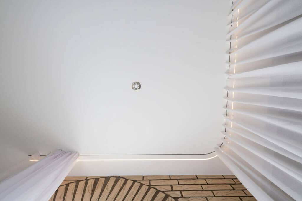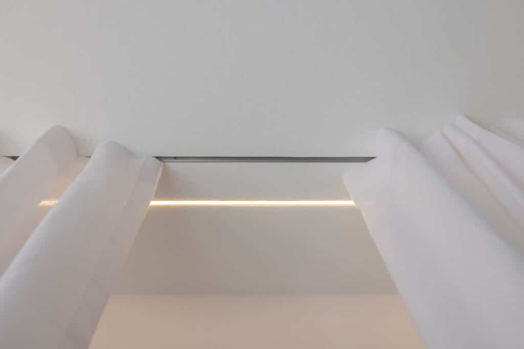Sistem plošč omogoča integracijo LED-trakov, katerih rezultat je svetlobna linija, ki se razliva po stropu in ustvari pomirjujočo, ambientalno osvetlitev. »Ko se zvečer prižge mehka linija svetlobe, prostor dobi globino, eleganco,« pravi Aljaž in doda, da pa v spalnici mavčne plošče služijo tudi za zavese, s čimer sta se izognila montaži karnis in ustvarila še bolj izčiščen interjer.