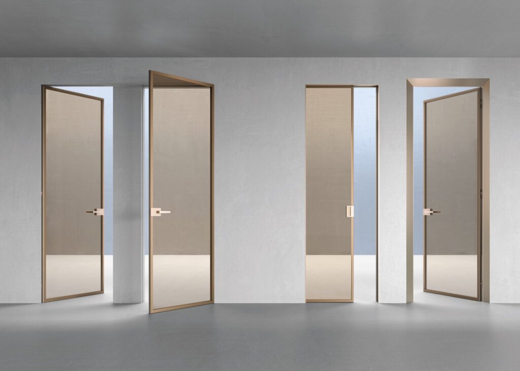 Stekleno krilo v kovinskem okvirju iz eloksiranega ali barvanega aluminija je na voljo v različnih barvah (od aluminijaste do odtenkov Champagne, Bronze in Tobacco) ter z različnimi vrstami stekla (prozorno, satinirano, dimno ali refleksno). Dvoplastna zasteklitev izboljša zvočno izolacijo, minimalistični ročaji pa omogočajo, da se vrata skoraj popolnoma potopijo v steno.