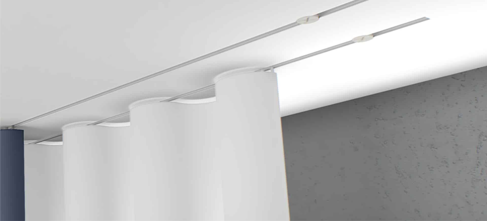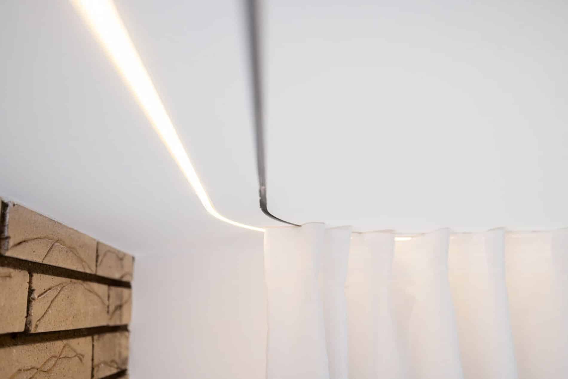 Sistem plošč omogoča integracijo LED-trakov, katerih rezultat je svetlobna linija, ki se razliva po stropu in ustvari pomirjujočo, ambientalno osvetlitev. »Ko se zvečer prižge mehka linija svetlobe, prostor dobi globino, eleganco,« pravi Aljaž in doda, da pa v spalnici mavčne plošče služijo tudi za zavese, s čimer sta se izognila montaži karnis in ustvarila še bolj izčiščen interjer.