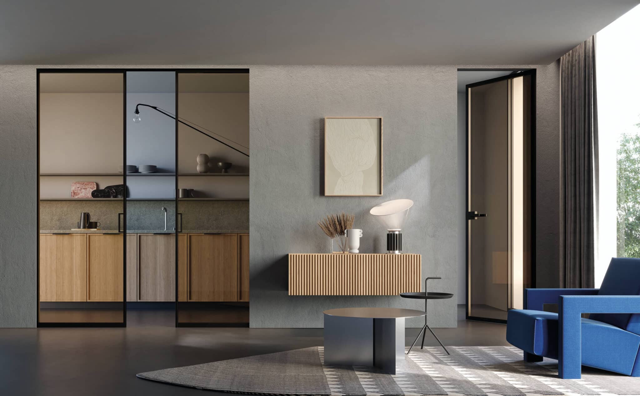 Stekleno krilo v kovinskem okvirju iz eloksiranega ali barvanega aluminija je na voljo v različnih barvah (od aluminijaste do odtenkov Champagne, Bronze in Tobacco) ter z različnimi vrstami stekla (prozorno, satinirano, dimno ali refleksno). Dvoplastna zasteklitev izboljša zvočno izolacijo, minimalistični ročaji pa omogočajo, da se vrata skoraj popolnoma potopijo v steno.