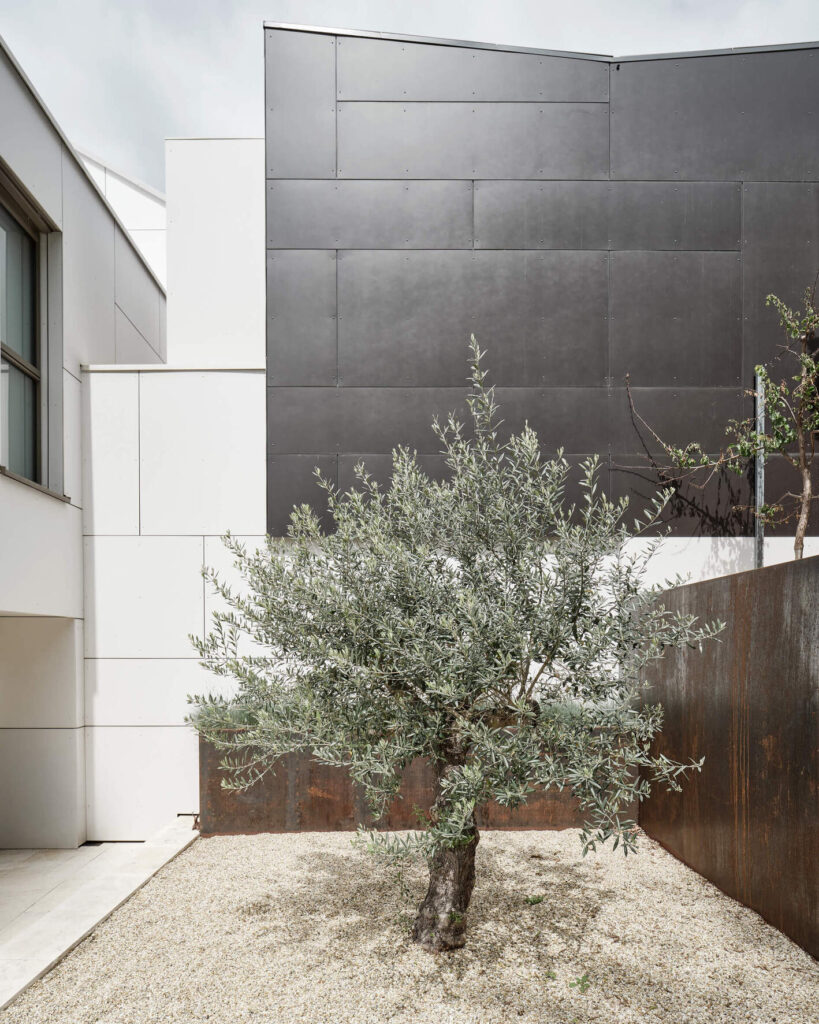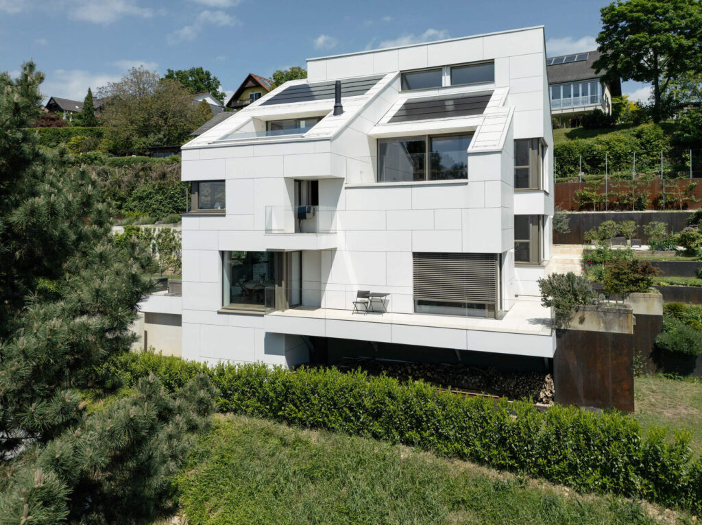 Monoliten, umirjen videz hiše je dosežen z uporabo enotnega materialnega jezika za streho in fasado. Fasadna obloga iz plošč Swisspearl Largo Carat v svetlih in temnih tonih poudarja natančne linije ter čist, sodoben izraz stavbe. Velikoformatni elementi ustvarjajo vizualno harmonijo, preplet obeh barvnih odtenkov pa se subtilno odziva na igro svetlobe in sence, ki jo narekuje pobočje. Projekt dodatno zaznamujejo energetsko učinkovita leseno-aluminijasta okna, izolacija iz lesnih vlaken in skrbno izdelani detajli, ki uspešno povezujejo obstoječo strukturo z moderno, precizno materialnostjo.