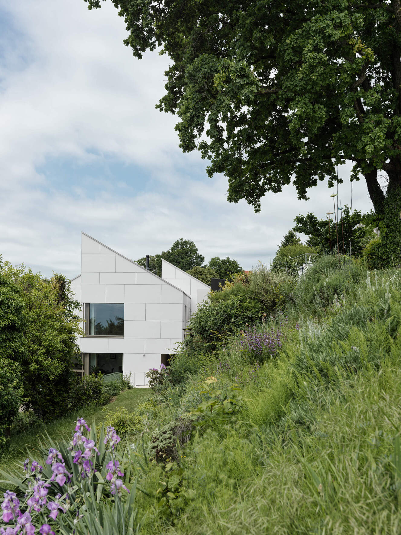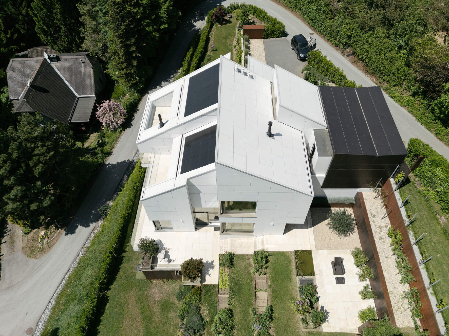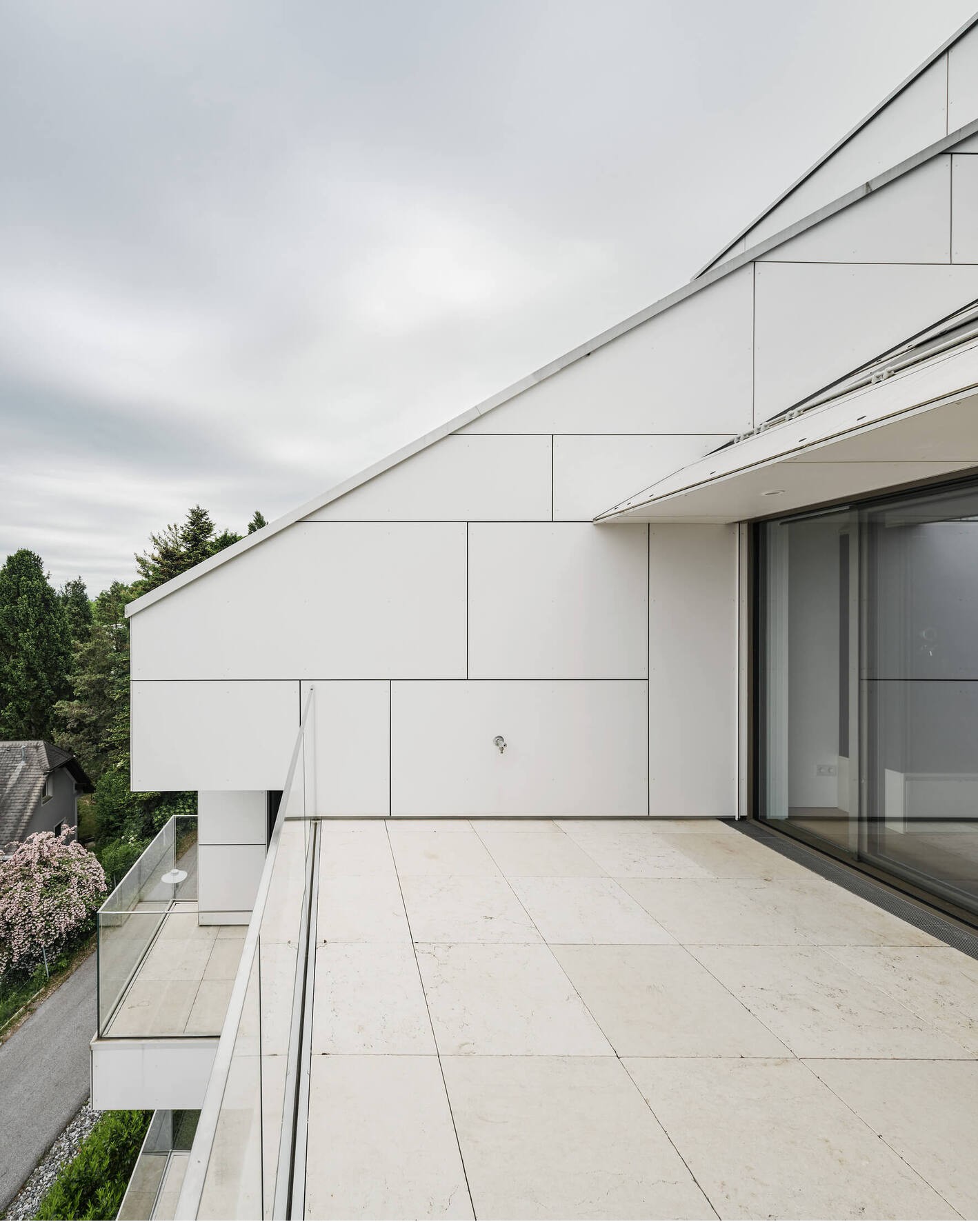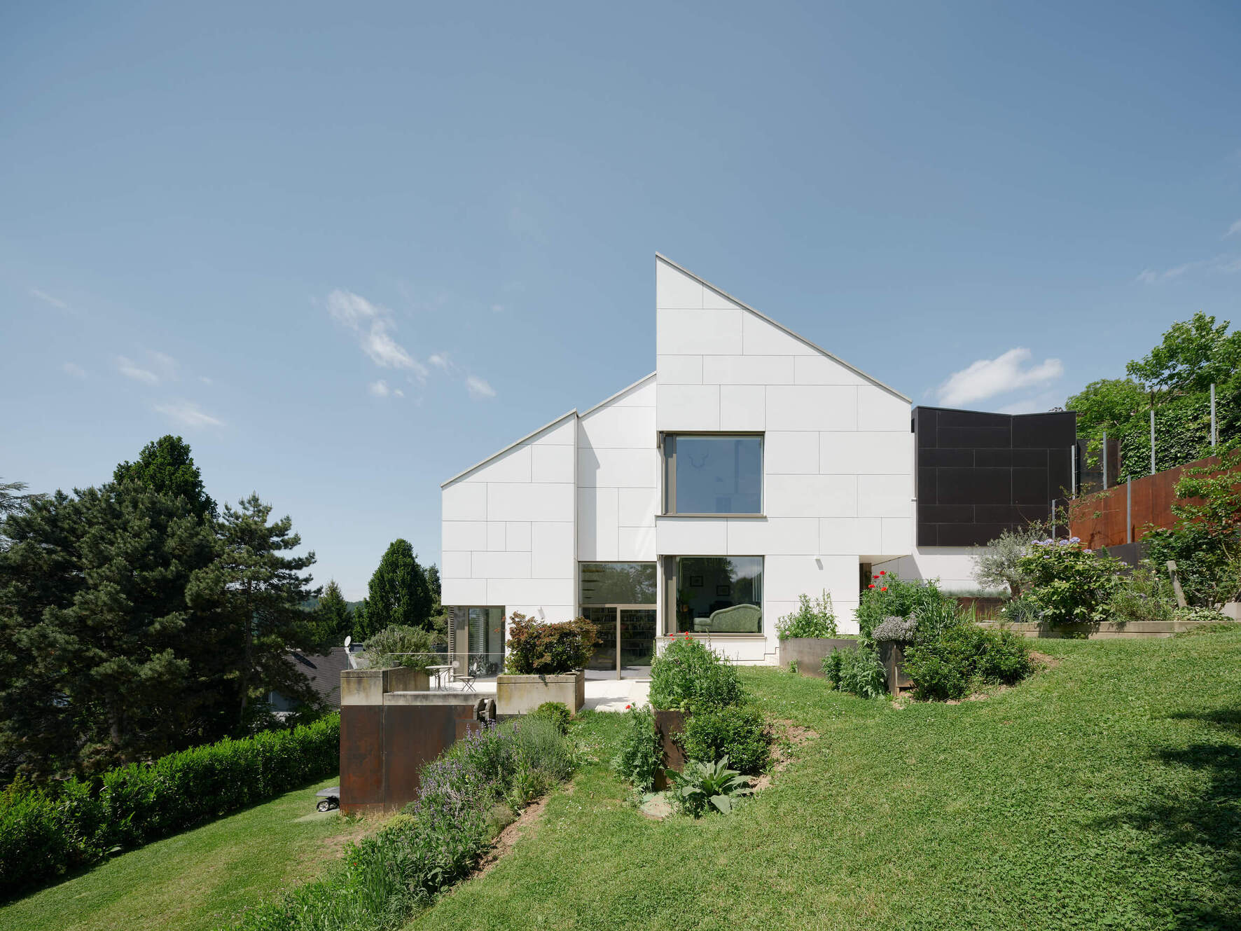Monoliten, umirjen videz hiše je dosežen z uporabo enotnega materialnega jezika za streho in fasado. Fasadna obloga iz plošč Swisspearl Largo Carat v svetlih in temnih tonih poudarja natančne linije ter čist, sodoben izraz stavbe. Velikoformatni elementi ustvarjajo vizualno harmonijo, preplet obeh barvnih odtenkov pa se subtilno odziva na igro svetlobe in sence, ki jo narekuje pobočje. Projekt dodatno zaznamujejo energetsko učinkovita leseno-aluminijasta okna, izolacija iz lesnih vlaken in skrbno izdelani detajli, ki uspešno povezujejo obstoječo strukturo z moderno, precizno materialnostjo.