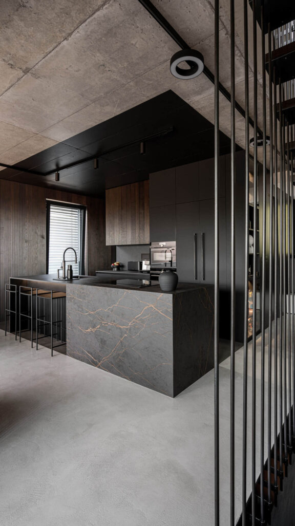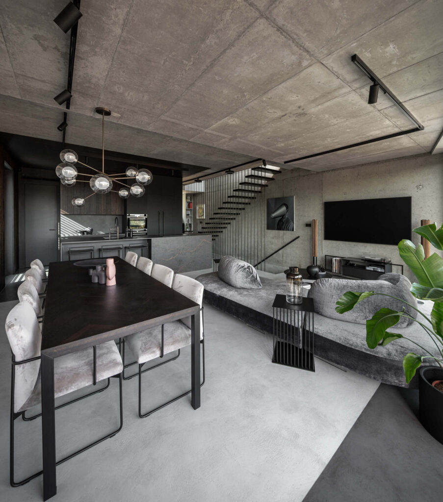 Osrednji motiv stanovanja je viden beton, ki se pojavlja v vseh treh etažah. Že med gradnjo so arhitekti z naročniki sprejeli odločitev, da beton ohranijo v surovi obliki, s tem pa je robustna, a hkrati elegantna struktura postala hrbtenica celotnega prostora.