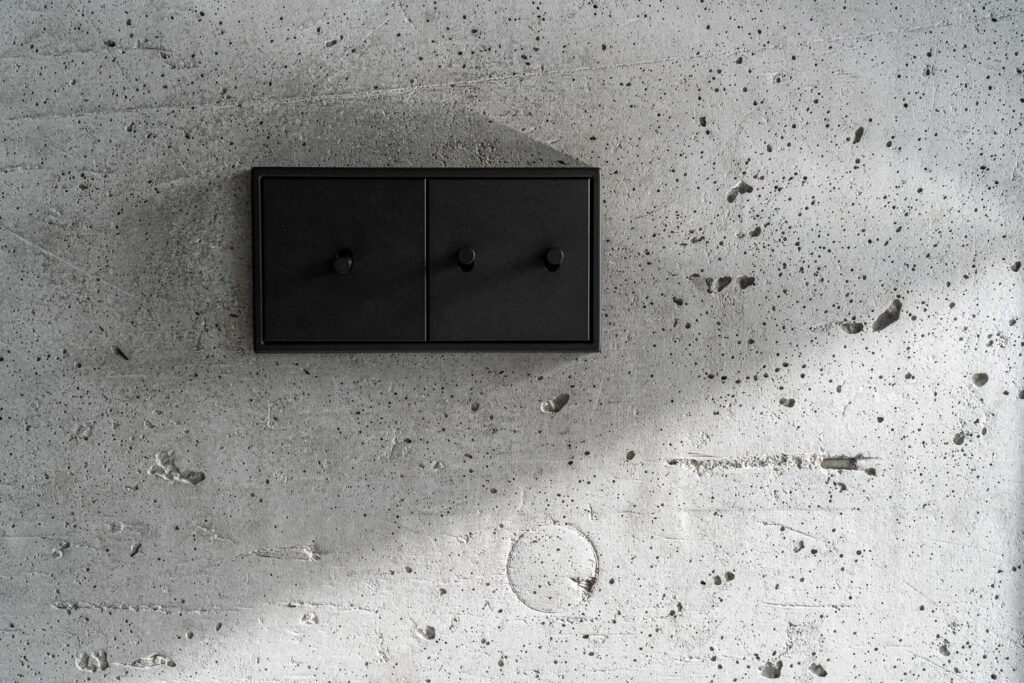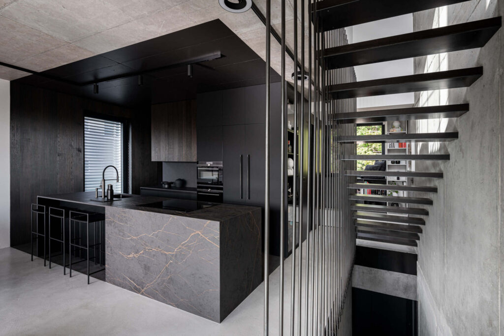 Vsaka etaža skriva svojo t. i. črno škatlo, pri čemer se v tlaku, stenah in v stropu izrazi globok, mat črn ton. V dnevnem prostoru je ta vloga dodeljena kuhinji, obloženi s kamnom in z lesom, ki ustvarjata dramatičen kontrast betonu. V spalnici črna škatla skriva posteljo z integriranimi shranjevalnimi prostori in s knjižno polico ob vzglavju. Tretja črna škatla se nahaja v delovni sobi, pri čemer črna barva ustvari mirno, zbrano atmosfero.