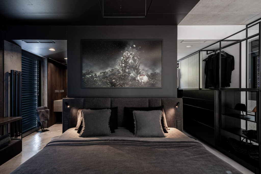 Vse pohištvo, z izjemo sedežne garniture, je narejeno po meri. Uporabljen je temen les, ki je bil v ta namen dimljen z amonijakom, s čimer so izvajalci zagotovili globoko obarvanost in preprečili, da bi se morebitne praske svetleje poznale. Kovinski poudarki iz jekla se pojavljajo v obliki vinilnih stojal, nočnih mizic in okvirjev. V spalnici posebno pozornost pritegne omara iz jekla in stekla, pri čemer so razstavljeni lastnikovi najljubši modni dodatki – klobuki, torbe in nakit.
