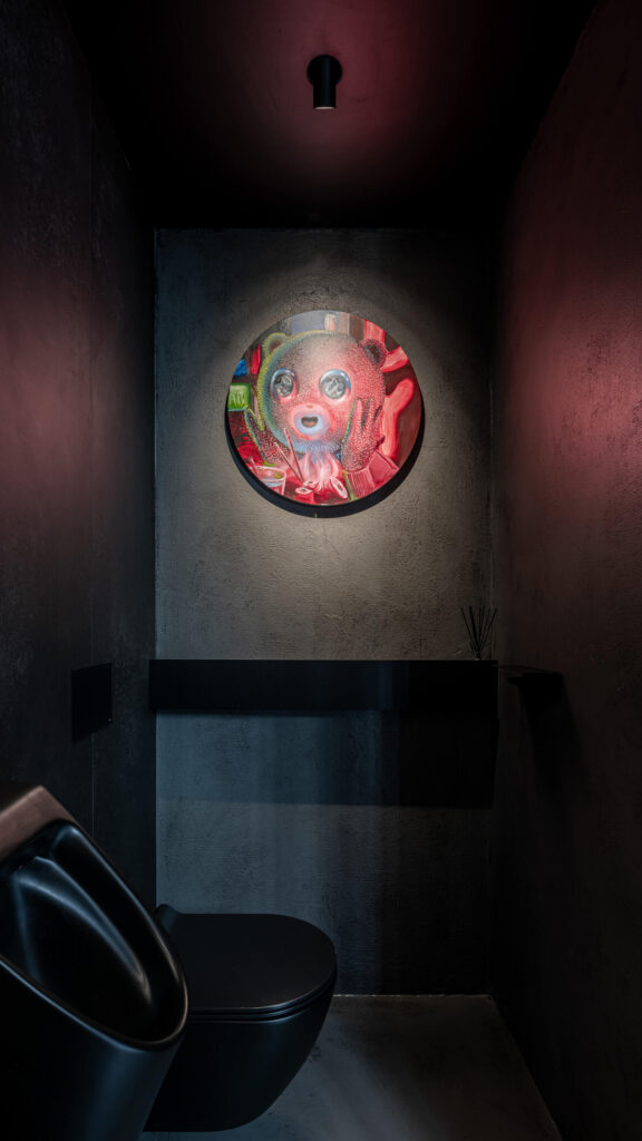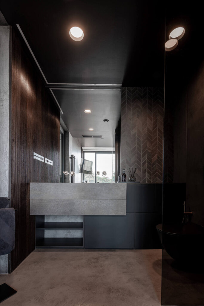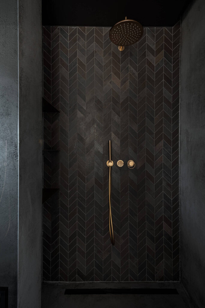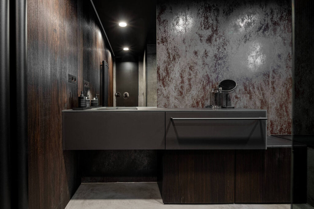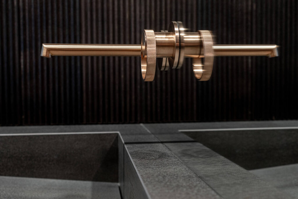 Glavna kopalnica je kombinacija temnih, velikih keramičnih ploščic in medeninastih armatur, ki v prostor vnašajo eleganco in prestiž. Investitor je arhitektom že v samem začetku omogočil vgradnjo skritih delov armatur, s čimer so se izognili poznejšim posegom. Ena izmed kopalnic se ponaša celo s stropno armaturo, redko videno v stanovanjih tega tipa.