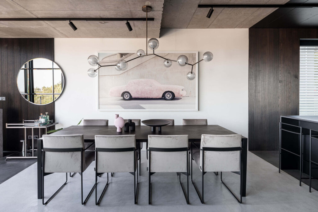 V dnevnem prostoru kraljuje viseče stopnišče iz jeklenih palic, pri čemer je vsaka stopnica izdelana iz tankih jeklenih lamel, obloženih z lesom, kar ustvarja občutek lahkotnosti in lebdenja. Montaža te konstrukcije je zahtevala usklajeno delo treh strok hkrati, rezultat pa je estetsko in tehnično dovršen element, ki postane osrednji fokus prostora.