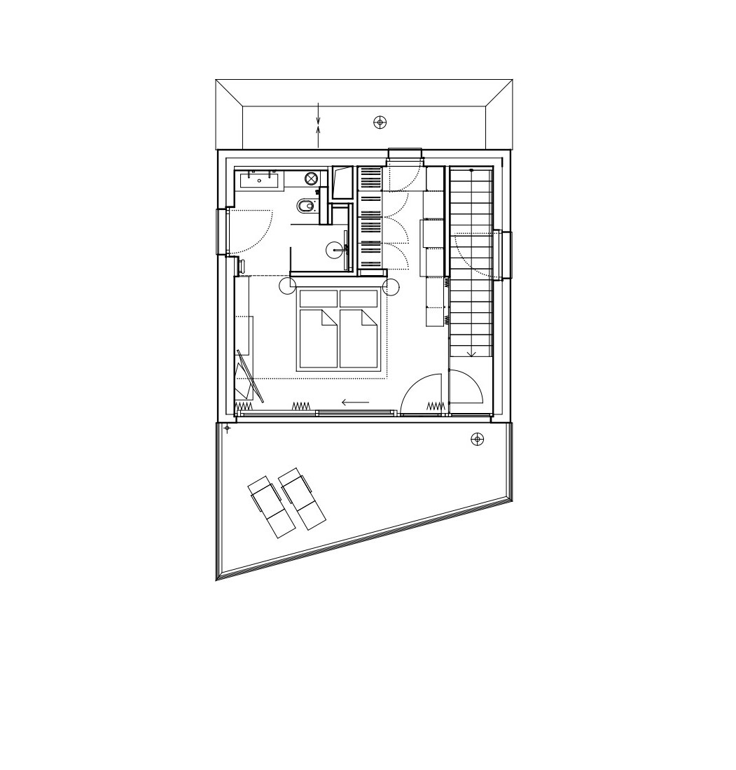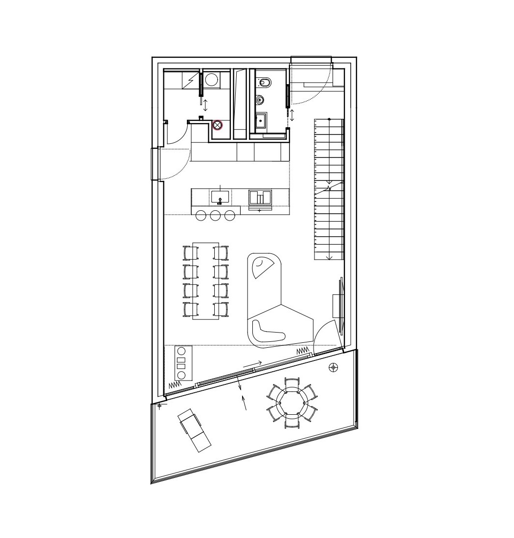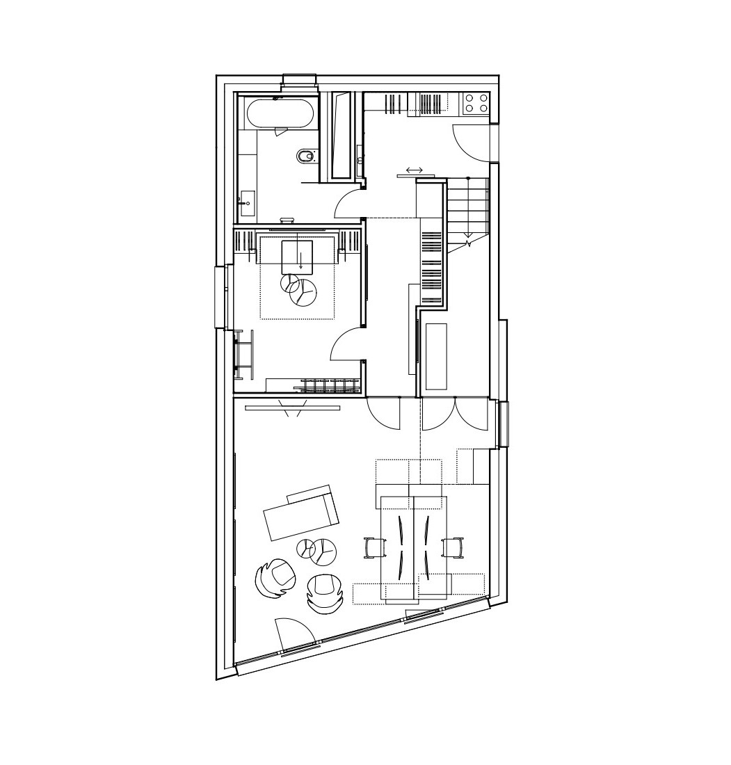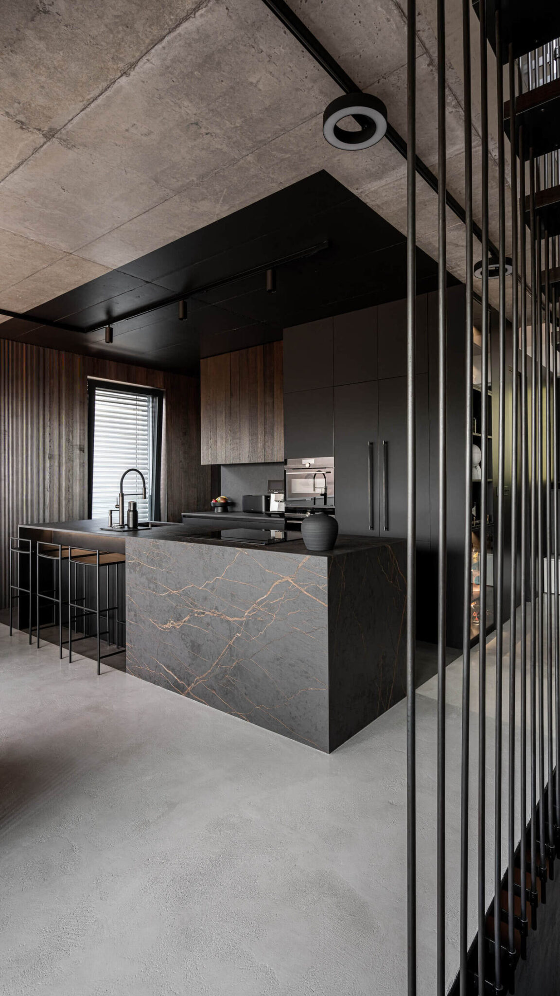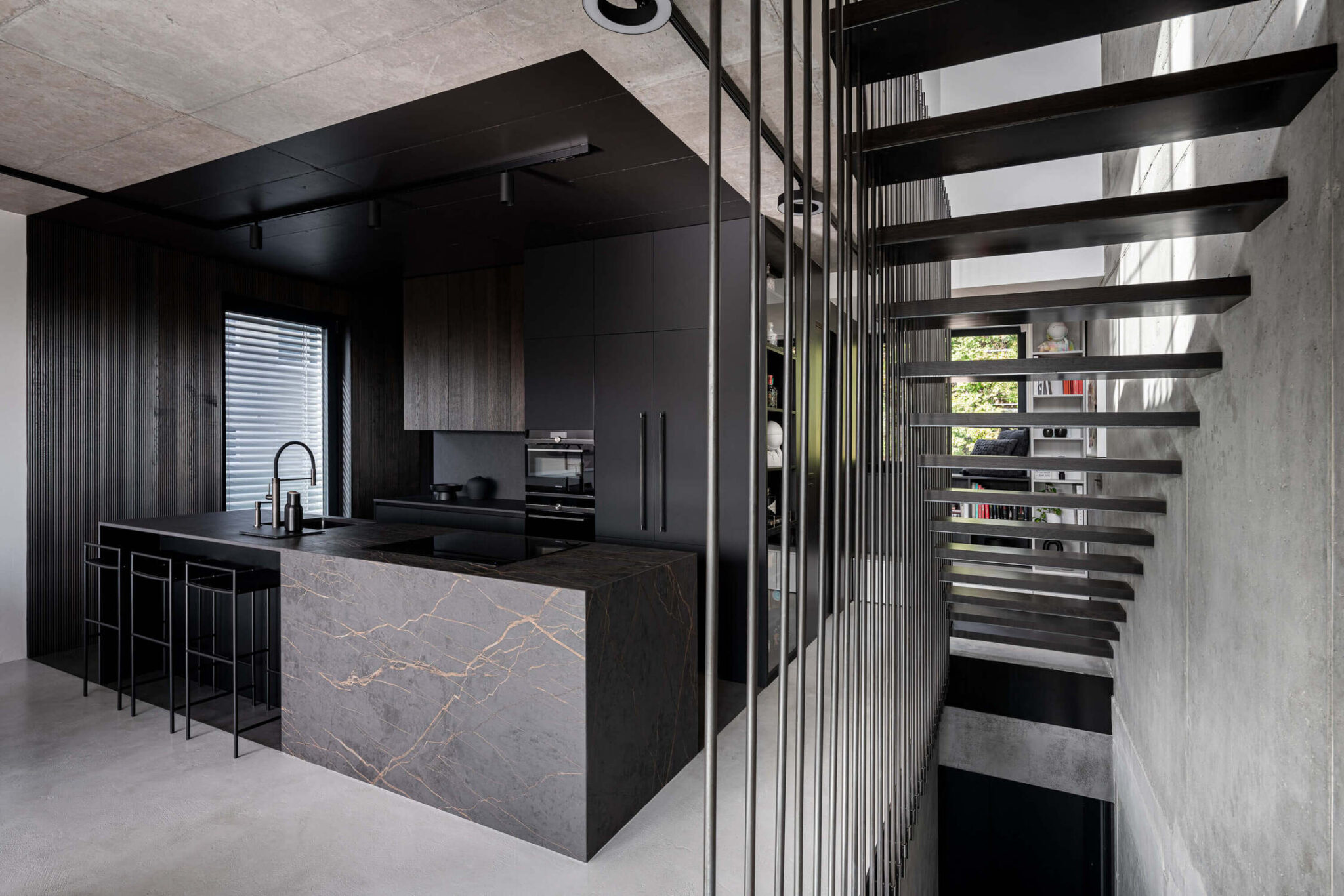 V dnevnem prostoru kraljuje viseče stopnišče iz jeklenih palic, pri čemer je vsaka stopnica izdelana iz tankih jeklenih lamel, obloženih z lesom, kar ustvarja občutek lahkotnosti in lebdenja. Montaža te konstrukcije je zahtevala usklajeno delo treh strok hkrati, rezultat pa je estetsko in tehnično dovršen element, ki postane osrednji fokus prostora.