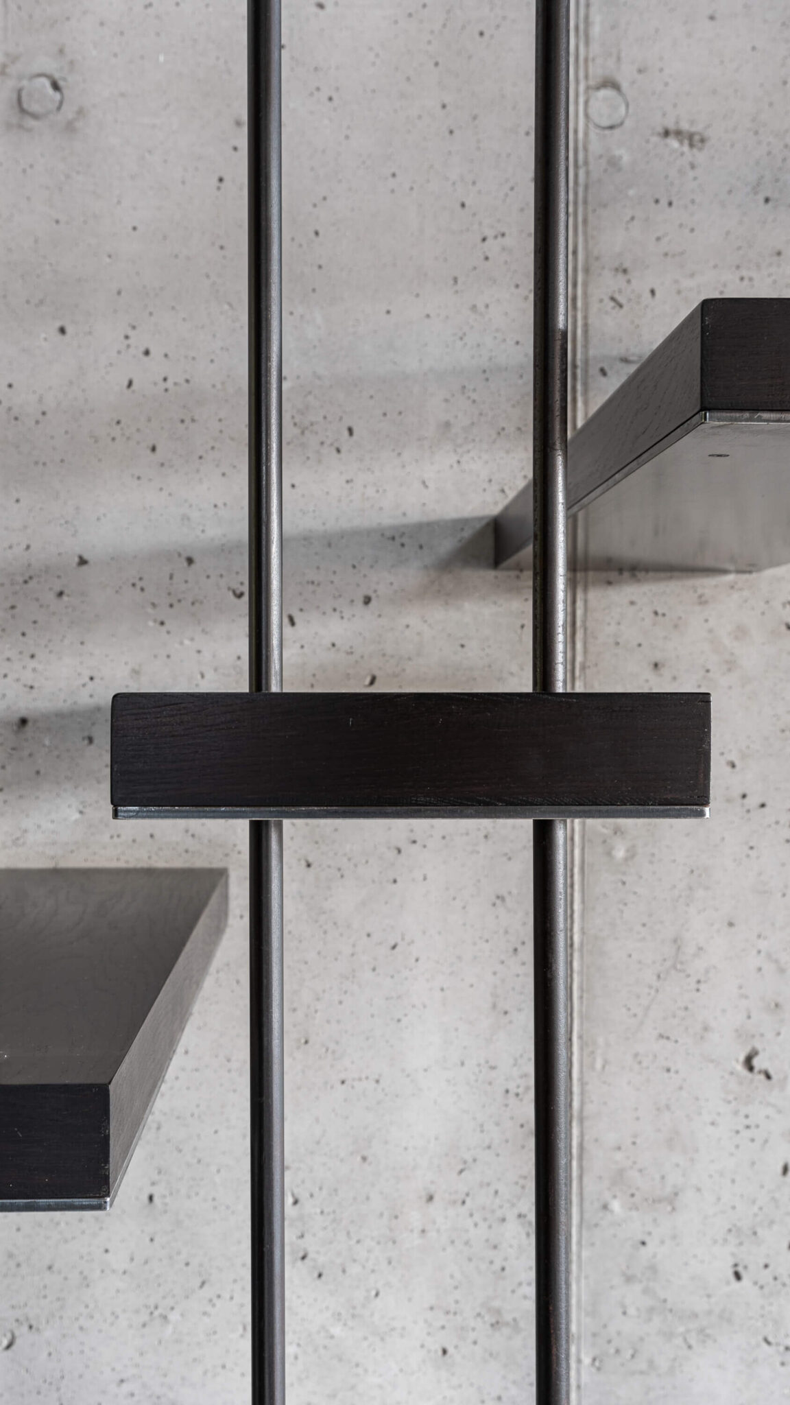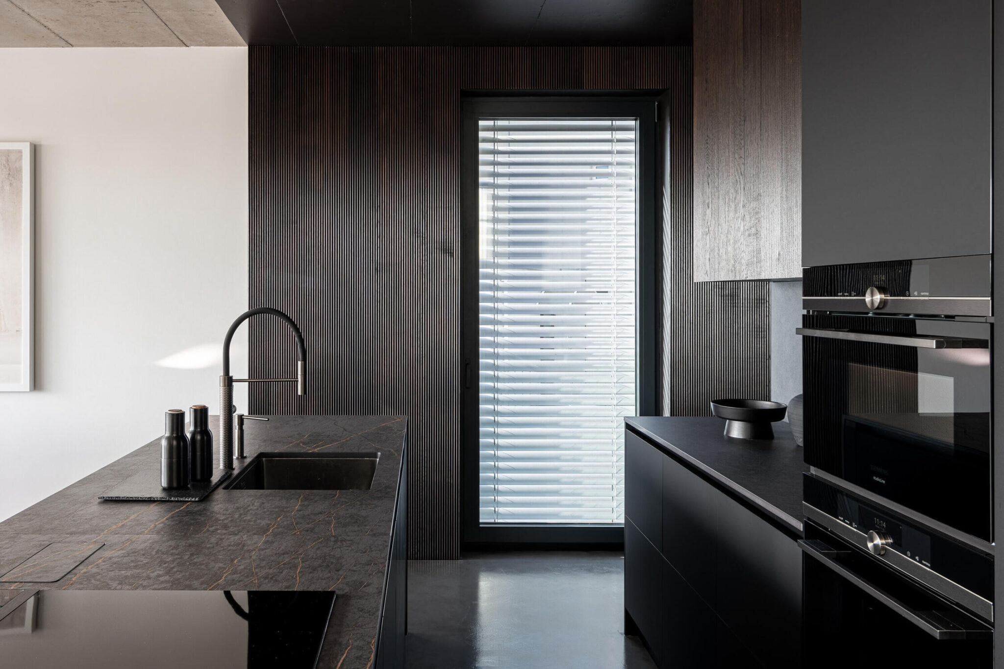 Vsaka etaža skriva svojo t. i. črno škatlo, pri čemer se v tlaku, stenah in v stropu izrazi globok, mat črn ton. V dnevnem prostoru je ta vloga dodeljena kuhinji, obloženi s kamnom in z lesom, ki ustvarjata dramatičen kontrast betonu. V spalnici črna škatla skriva posteljo z integriranimi shranjevalnimi prostori in s knjižno polico ob vzglavju. Tretja črna škatla se nahaja v delovni sobi, pri čemer črna barva ustvari mirno, zbrano atmosfero.