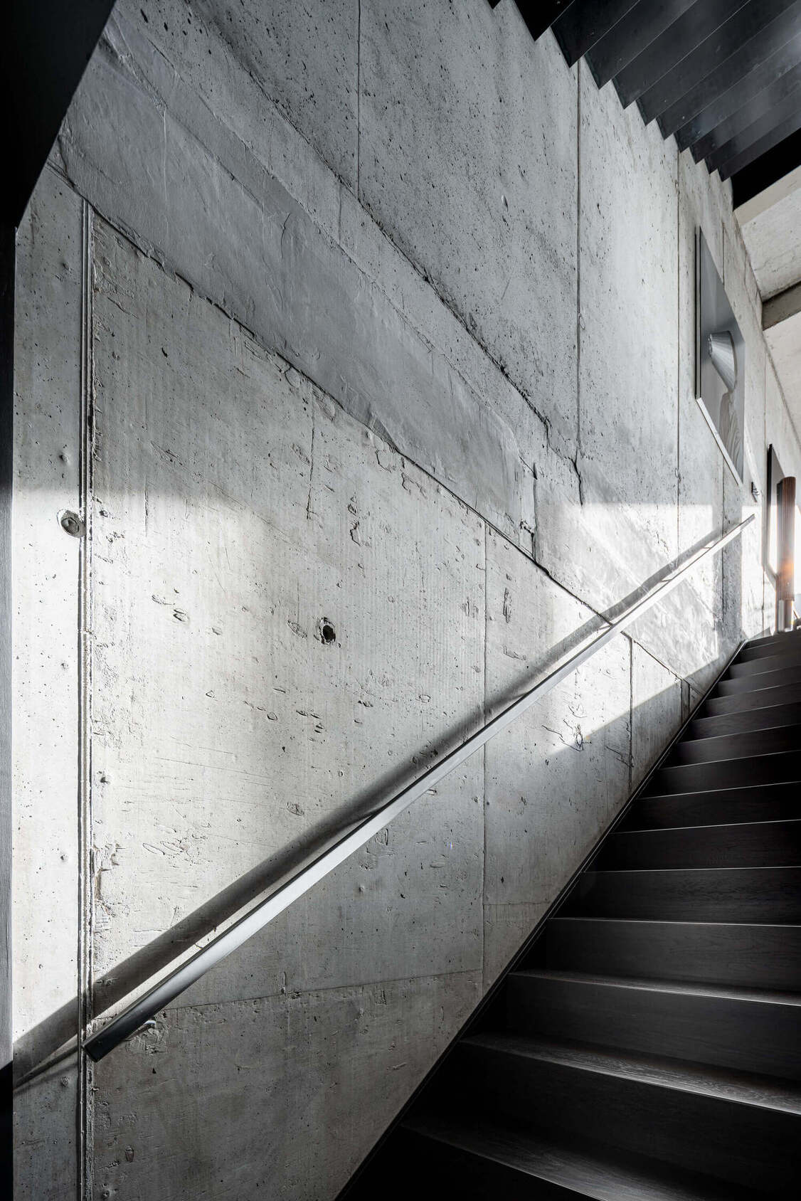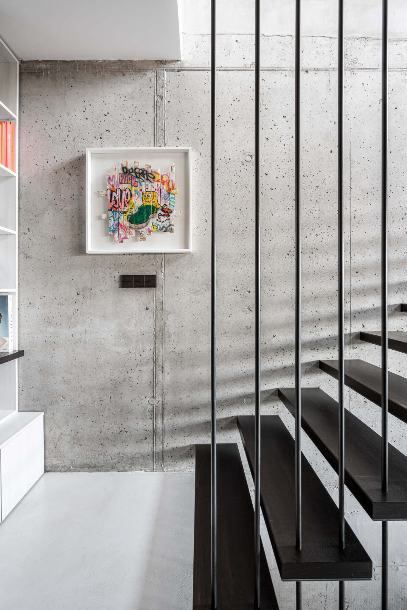 Osrednji motiv stanovanja je viden beton, ki se pojavlja v vseh treh etažah. Že med gradnjo so arhitekti z naročniki sprejeli odločitev, da beton ohranijo v surovi obliki, s tem pa je robustna, a hkrati elegantna struktura postala hrbtenica celotnega prostora.