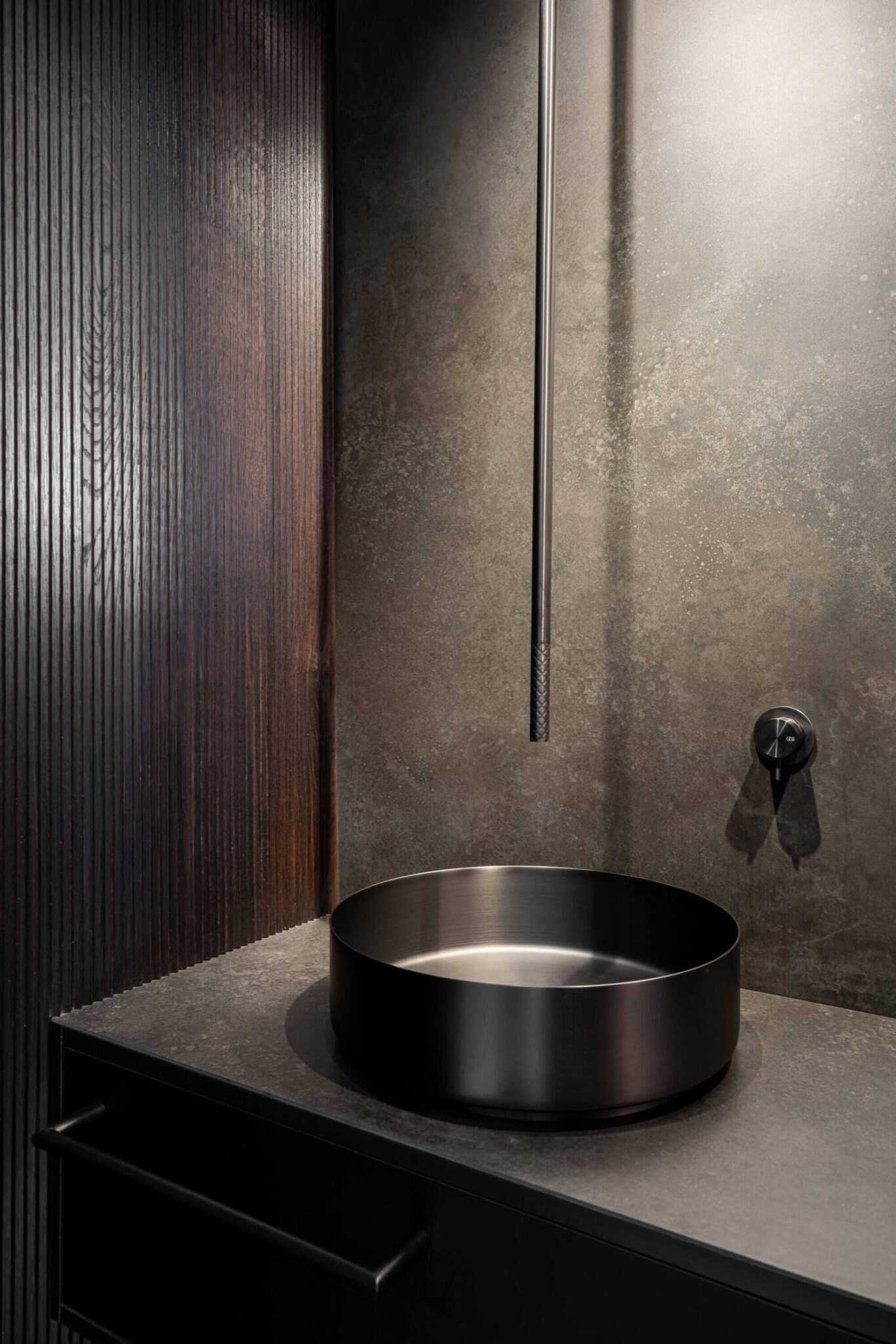 Glavna kopalnica je kombinacija temnih, velikih keramičnih ploščic in medeninastih armatur, ki v prostor vnašajo eleganco in prestiž. Investitor je arhitektom že v samem začetku omogočil vgradnjo skritih delov armatur, s čimer so se izognili poznejšim posegom. Ena izmed kopalnic se ponaša celo s stropno armaturo, redko videno v stanovanjih tega tipa.