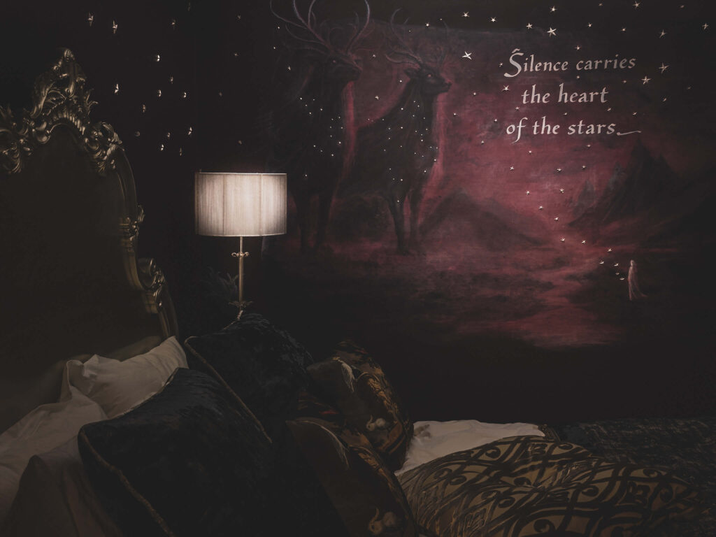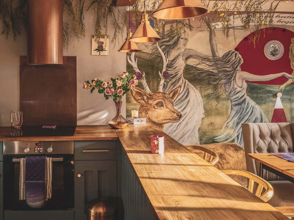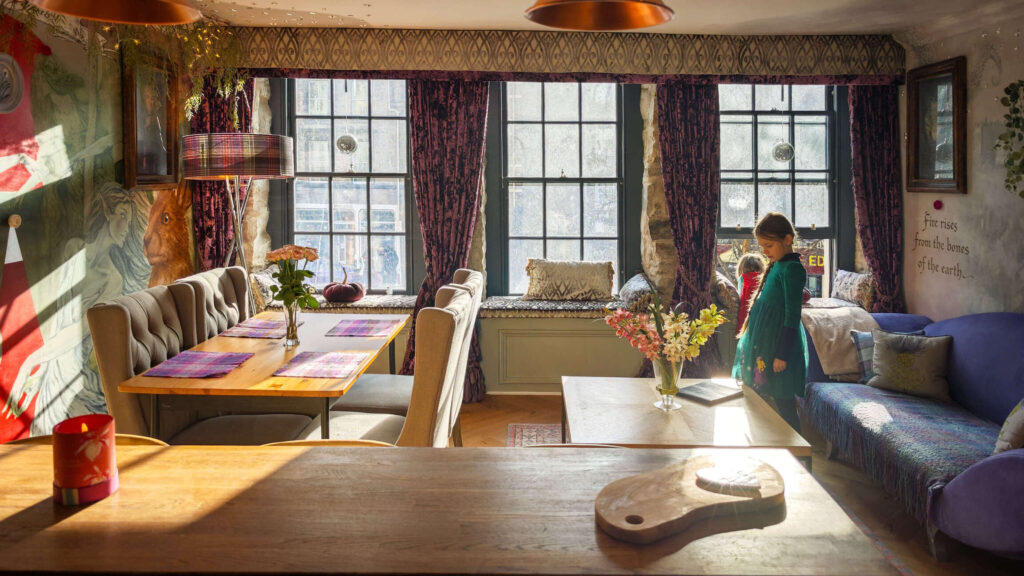 V starem mestnem jedru Edinburgha, med kamnitimi ulicami in stoletnimi zgodbami, se skriva stanovanje, ki danes ni več le prostor za bivanje, temveč skoraj pravljični svet. Njegove stene pripovedujejo zgodbe o zmajih, jelenih, vilah in skrivnostnih bitjih škotske mitologije. Za to nenavadno preobrazbo stojita slovenska ustvarjalca Ivan in Kaja Skrt, ki pod blagovno znamko Kot Sen ustvarjata unikatne interjerje na meji med umetnostjo, scenografijo in pripovedjo.
