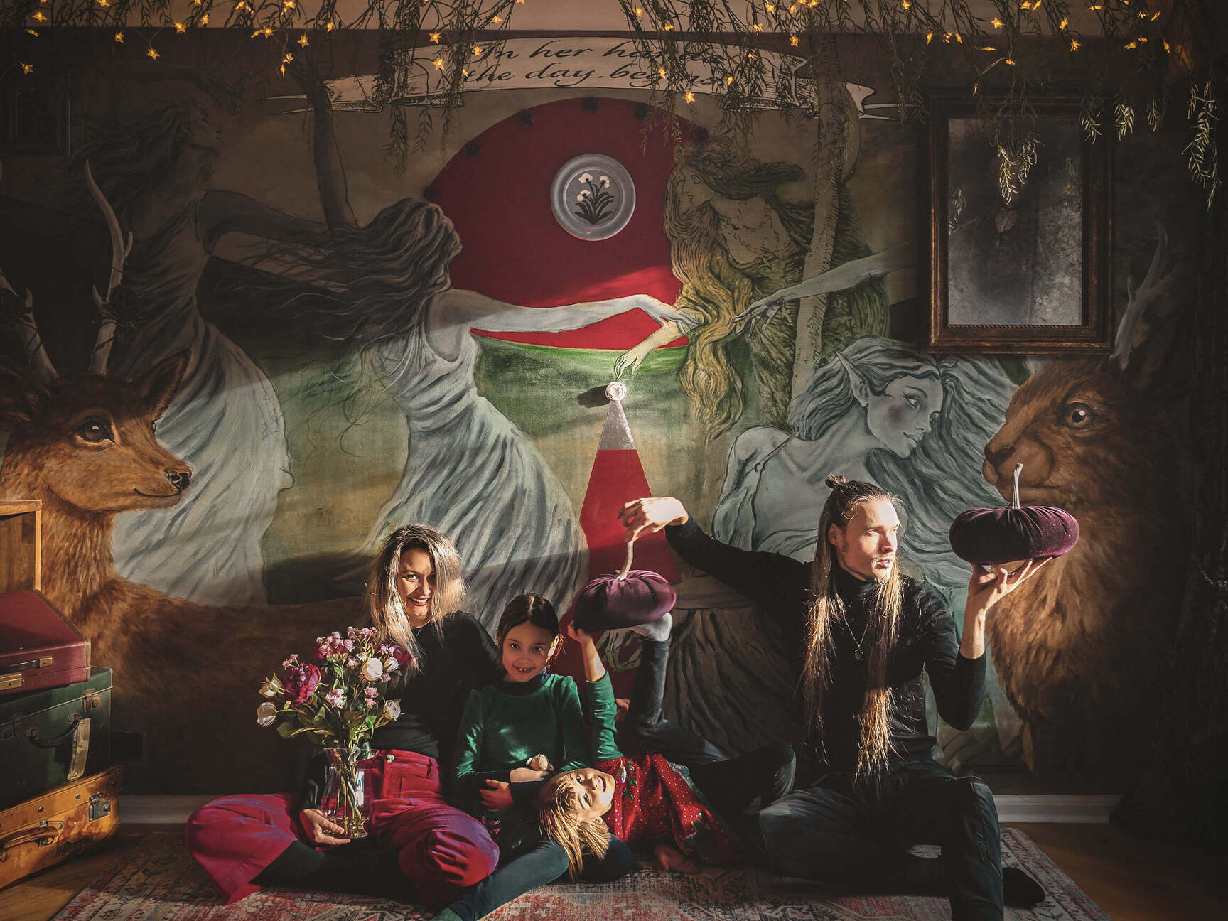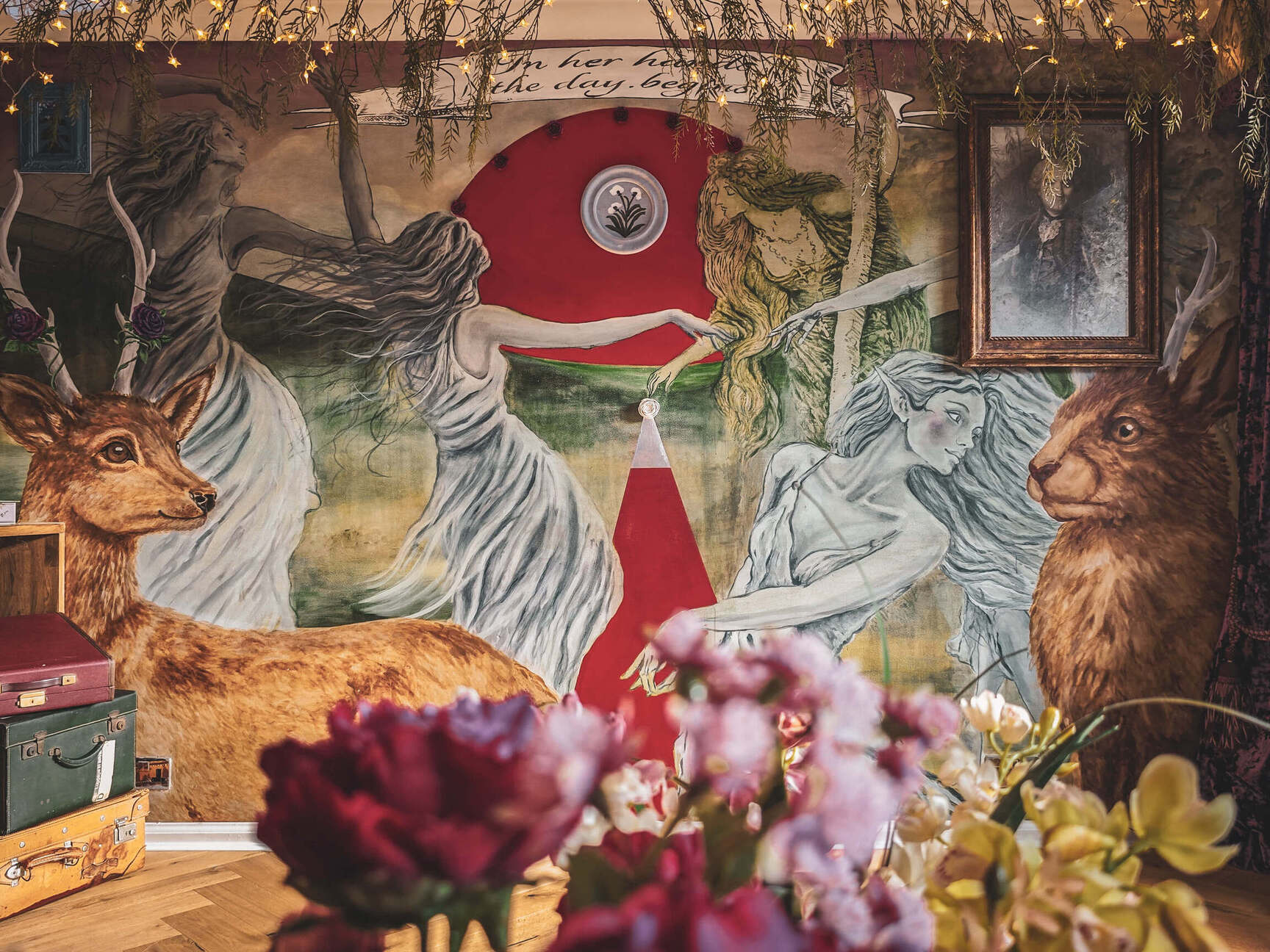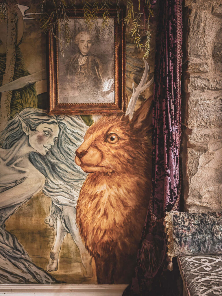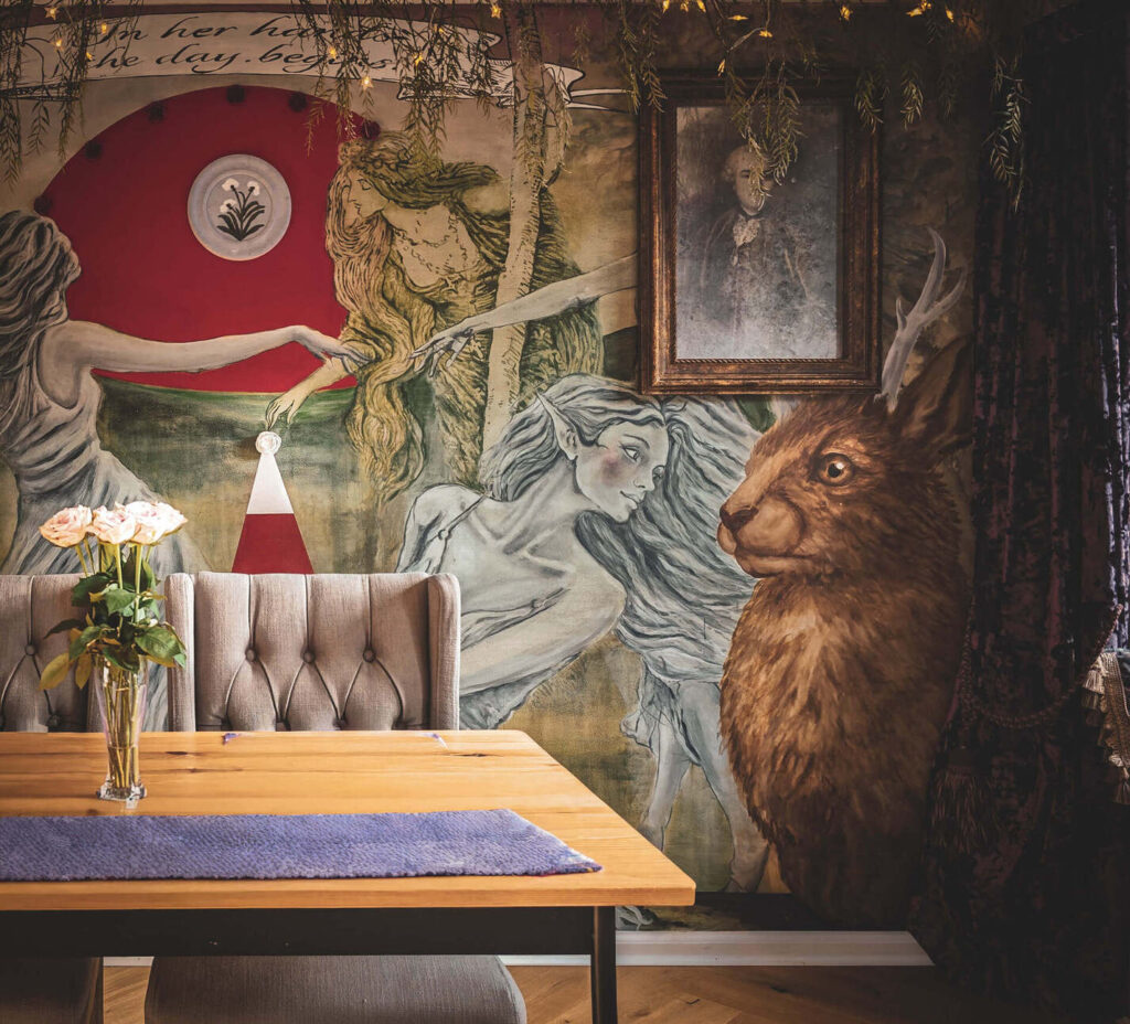 Danes stene stanovanja prikazujejo prizore, ki spominjajo na stare legende severa. Med njimi se pojavljajo jeleni, zmaji, zajci, skrivnostna dekleta in fantazijska bitja, ki kot da prihajajo iz sveta mitov. Poseben motiv je rdeč krog z zajcem, ki se pojavlja kot subtilen podpis ustvarjalcev – nekakšen simbol, ki se ponavlja tudi v drugih njunih ambientih.