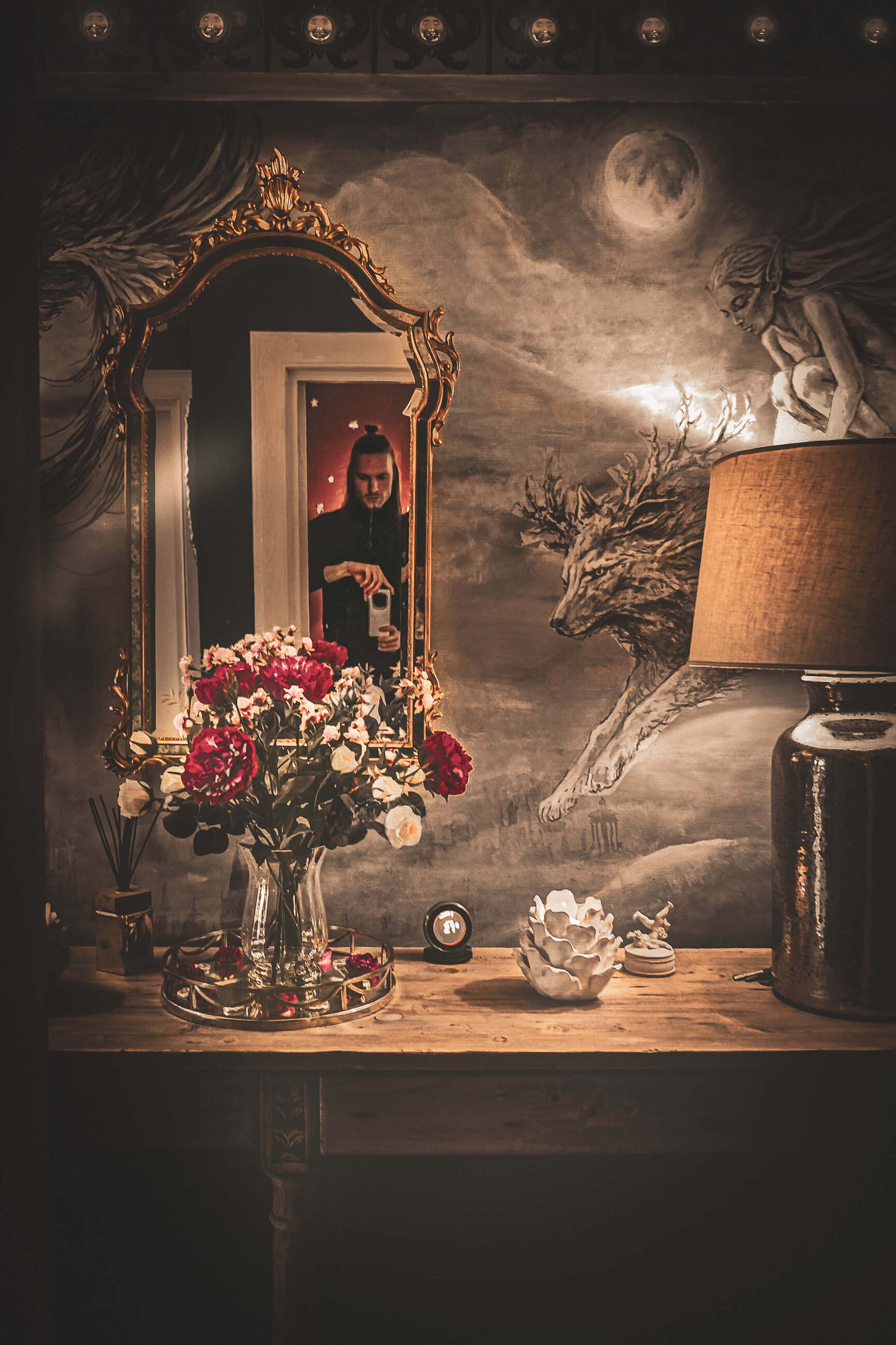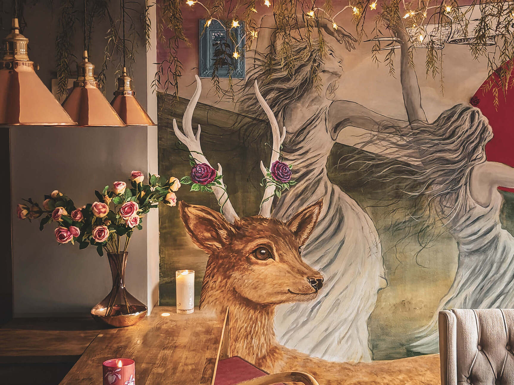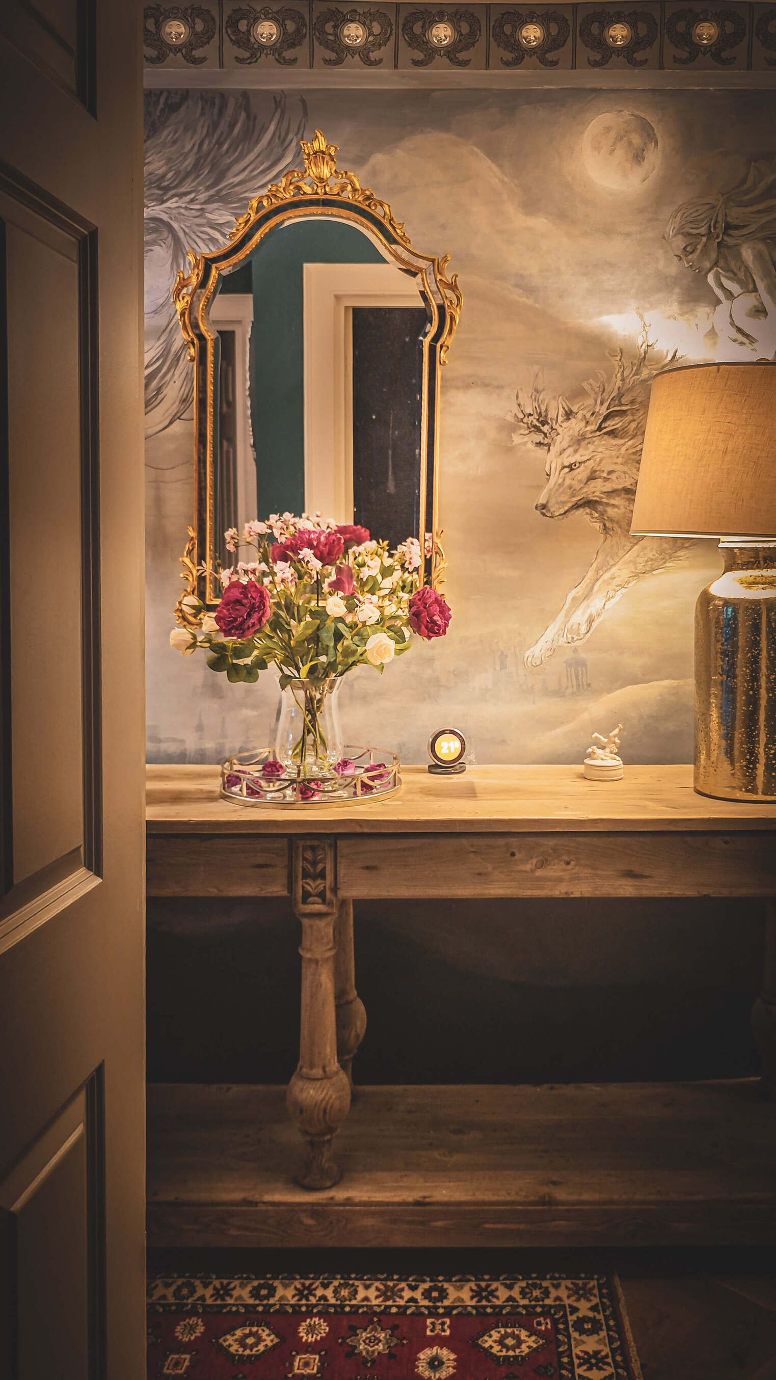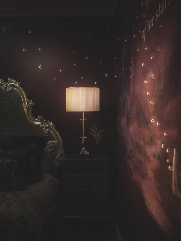 V osrednjem prostoru se poslikave prepletajo z opremo: starinskimi zavesami, toplimi tekstili, knjižnimi policami in skrbno izbranimi svetili. Ivan in Kaja namreč prostora nikoli ne obravnavata le kot steno za slikanje. Vedno razmišljata o celoti – o svetlobi, teksturah, predmetih in atmosferi.
