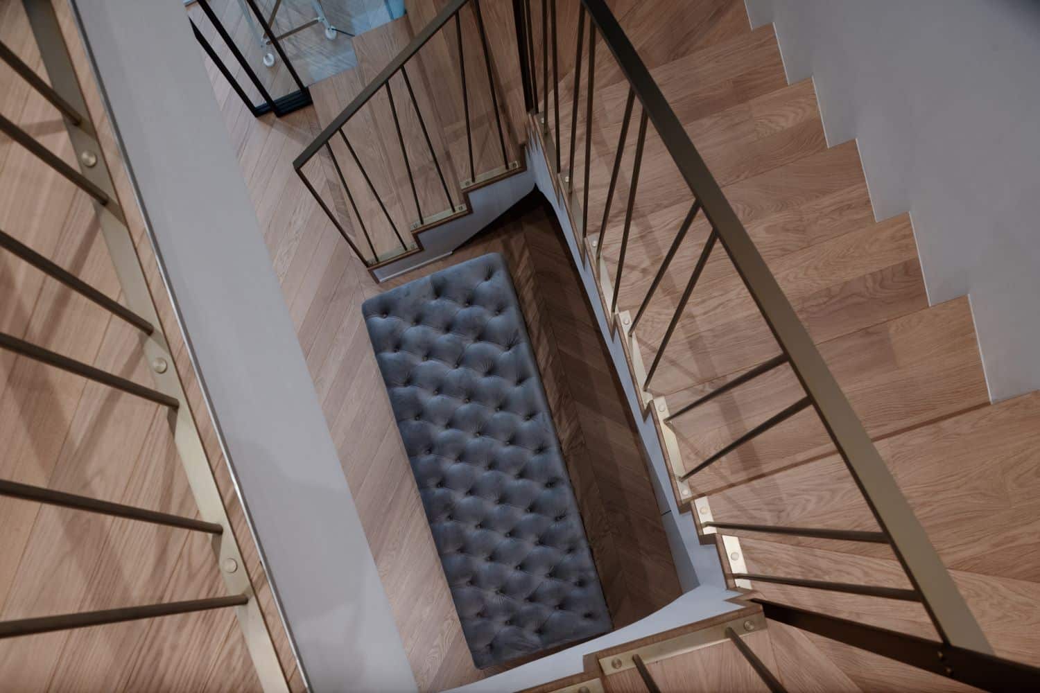 Prvi element, ki ga zagledamo, ko vstopimo v stanovanje, so elegantne, zaokrožene stopnice z unikatno, prekrasno medeninasto ograjo. Pod stopniščem je skritih nekaj garderobnih omar, pred njimi pa stoji velik tabure za preobuvanje.