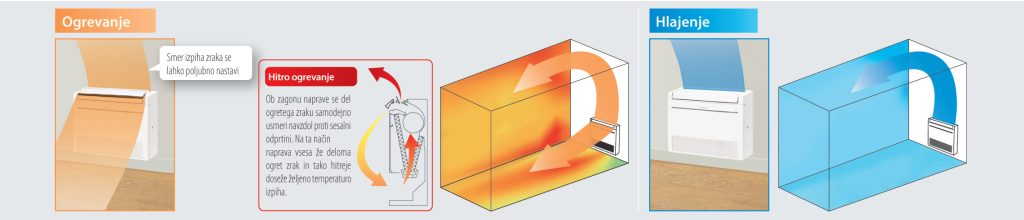 Izpostaviti je treba tudi talne klimatske naprave serije MFZ, ki zelo hitro ogrejejo prostor. Ob zagonu se del ogretega zraka samodejno usmeri navzdol prosti sesalni odprtini. Na ta način talna enota vsesa že deloma ogret zrak, zato hitreje doseže želeno temperaturo izpiha. Z ustrezno in učinkovito razporeditvijo zraka, izpihanega skozi zgornje lamele, talna klimatska naprava Mitsubishi Electric zagotavlja optimalno sobno temperaturo, kot izpiha zraka skozi zgornje lamele pa se lahko s pomočjo daljinskega upravljalnika spreminja v pet različnih smeri (+ način Swing in Auto). Naprava omogoča tudi štiri različne moči izpihanega zraka (+ način Auto).