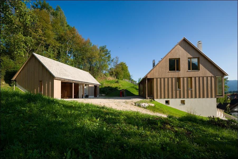 Hiša je nadomestna gradnja obstoječe, starejše domačije. Njena lega in gabarit subtilno zaključujeta silhueto vasi. Čeprav je hiša po prerezu štirinadstropna, je spretno umeščena v strm teren tako, da njene višine pravzaprav sploh ne opazimo. Skoraj štiristo kvadratnih metrov površine je po prerezu razdeljenih na manjše stanovanje staršev in večje stanovanje mlade družine.