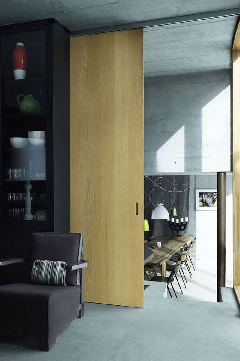Vsi prostori se orientirajo na atrij – od prostorne dnevne sobe, preko kuhinje, spalnice in celo kopalnic. Hiša v celoti sledi terenu – zato se višina stropov in tal nenehno spreminja. Visoka dnevna soba se tako spusti v kuhinjo, zgornje spalnice pa so vselej zasnovane na podestih, v nišah in prostorih, ki se prilagajajo strmini hriba.