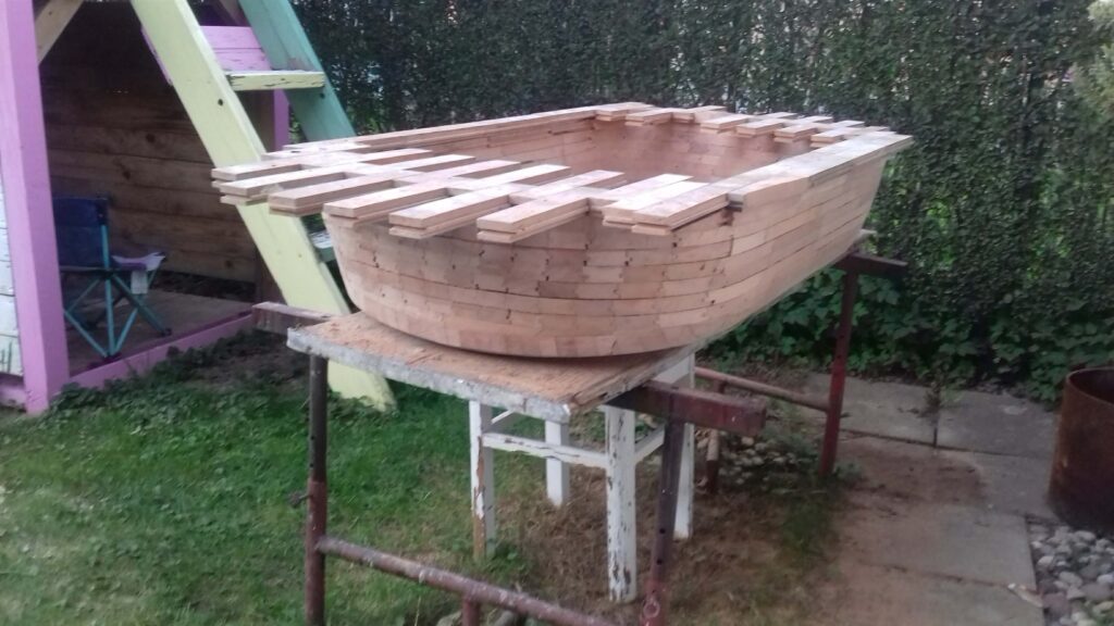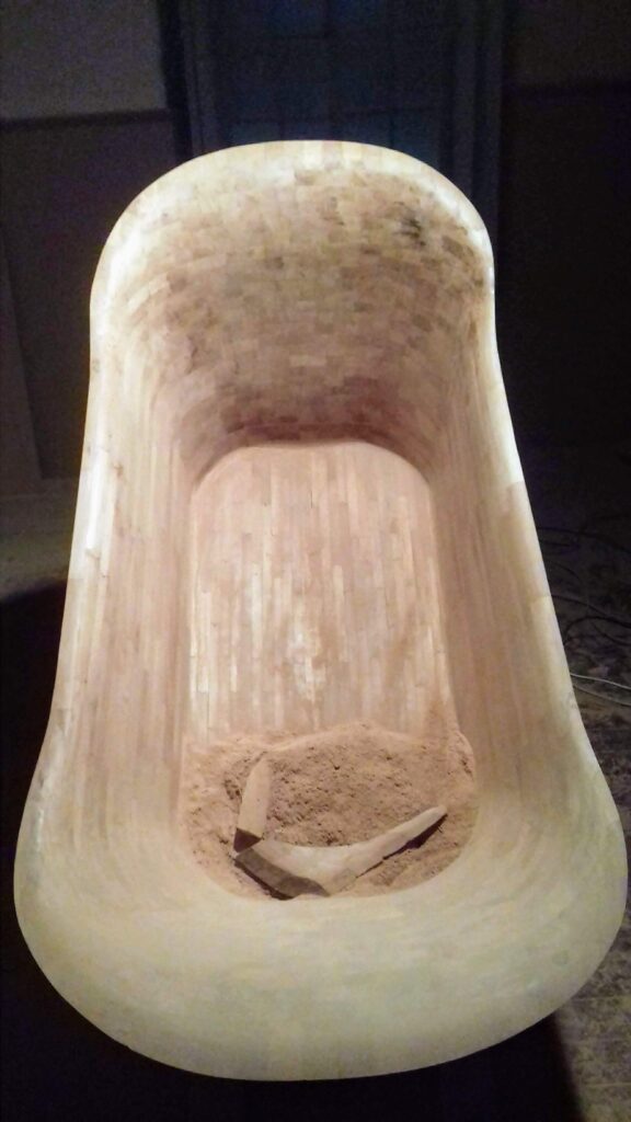 Začel je z dnom, ki ga je bilo najlažje izdelati, sledile so stene. Vsak kos je prilepil, obrezal in grobo oblikoval, nato je bilo na vrsti končno grobo rezkanje in fino brušenje. Sledili so tesnjenje in protimikrobna obdelava ter podnožje, ki so mu ga izdelali po naročilu. Nazadnje je leseni del še premazal z epoksidnim premazom, da je dosegel drugo stopnjo vodotesnosti, nato je sledilo nanašanje in poliranje do onemoglosti.