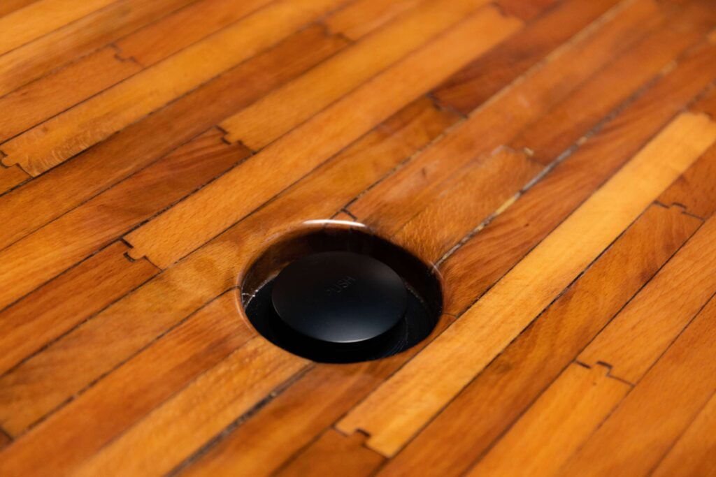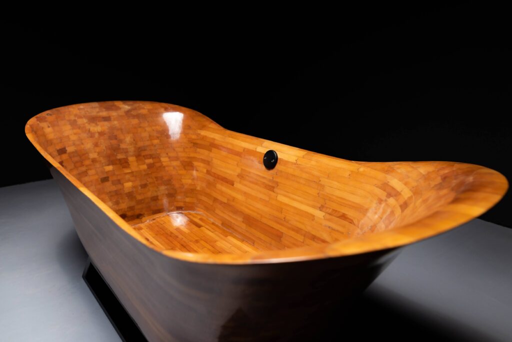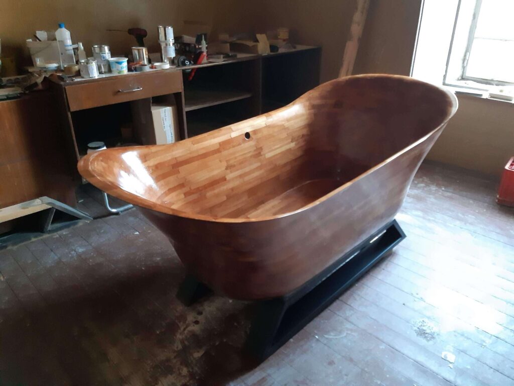 Kad je že v osnovi lepljena z vodoodpornimi lepili, zato že sam les drži vodo. Dodatno pa jo je tesnil še z dvokomponentno smolo, in sicer zaradi zagotavljanja vodotesnosti in sijaja. Pa tudi zato, ker smola deluje kot emajl, a je obenem dovolj fleksibilna, da omogoča dihanje lesa ob različnih temperaturnih spremembah. Ker je kot taka malce bolj občutljiva na praske, se za čiščenje priporoča uporaba neabrazivnih čistil na alkalni bazi, tako kot pri čiščenju keramične kadi. Enkrat letno pa se priporoča poliranje ali nanos glossa, da ohranimo njen sijaj.