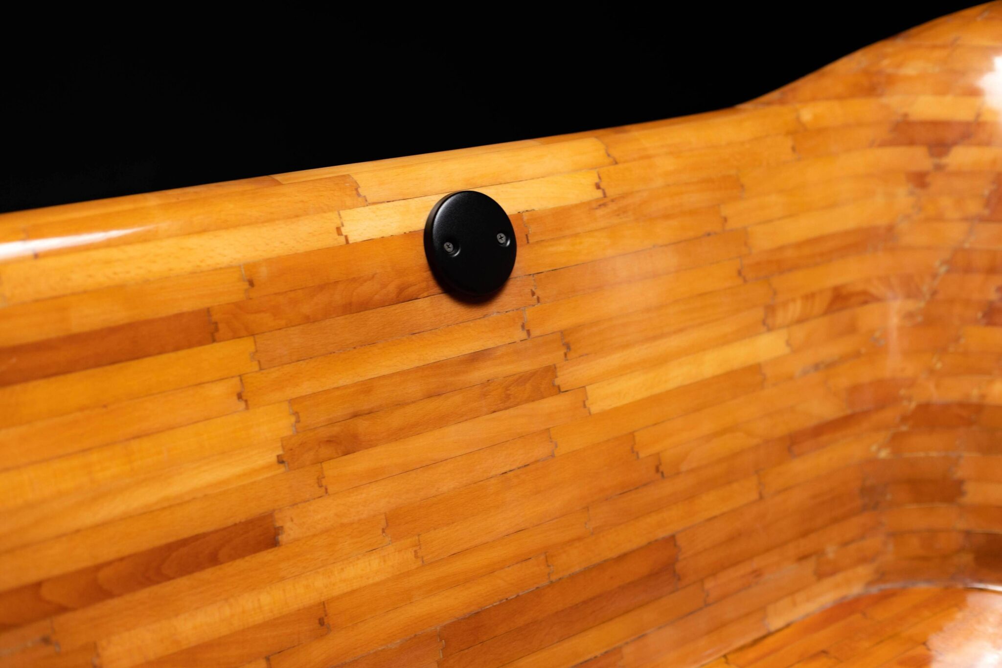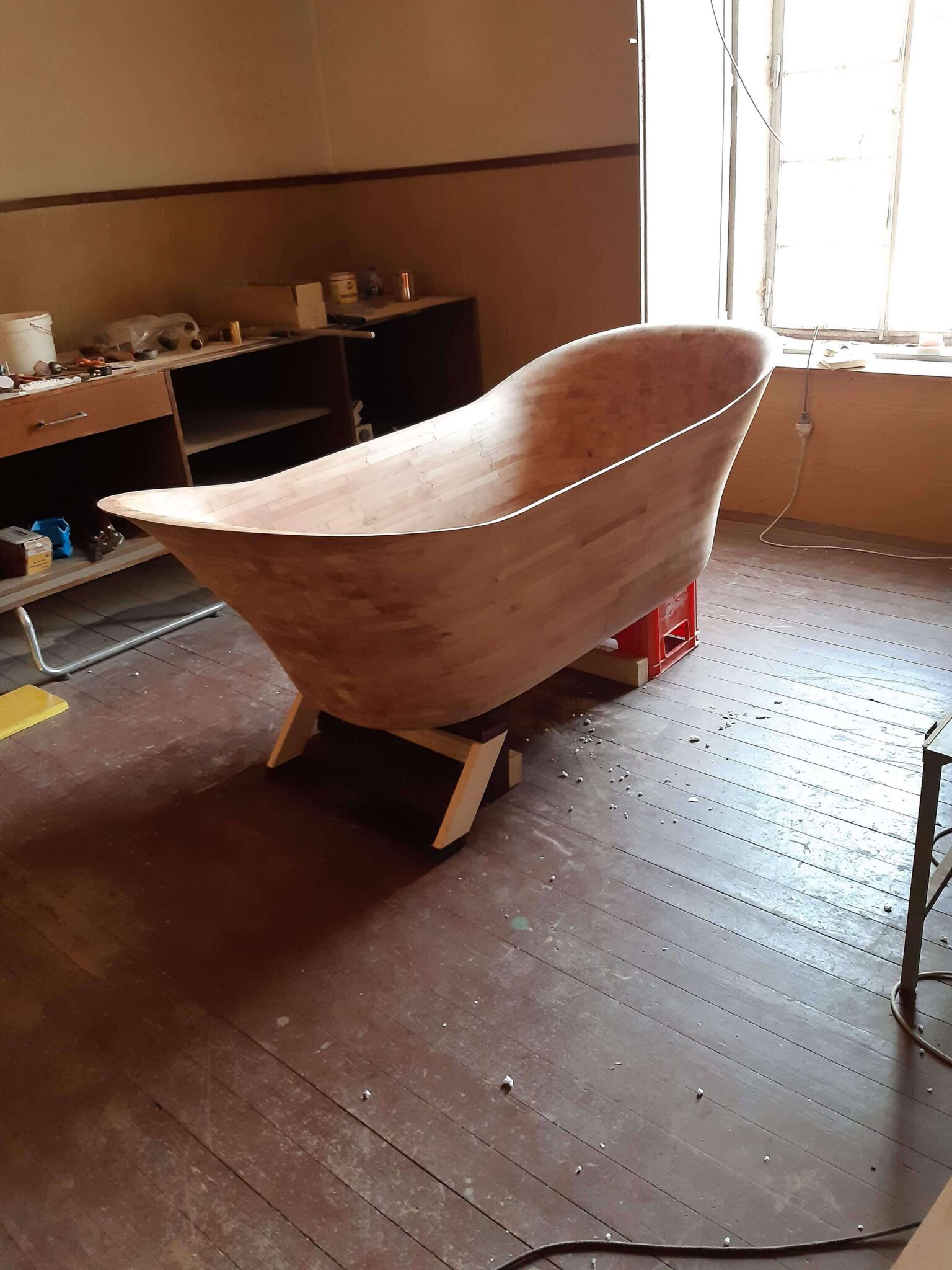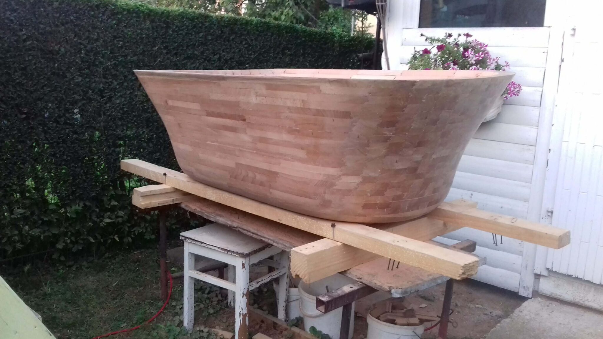 Začel je z dnom, ki ga je bilo najlažje izdelati, sledile so stene. Vsak kos je prilepil, obrezal in grobo oblikoval, nato je bilo na vrsti končno grobo rezkanje in fino brušenje. Sledili so tesnjenje in protimikrobna obdelava ter podnožje, ki so mu ga izdelali po naročilu. Nazadnje je leseni del še premazal z epoksidnim premazom, da je dosegel drugo stopnjo vodotesnosti, nato je sledilo nanašanje in poliranje do onemoglosti.