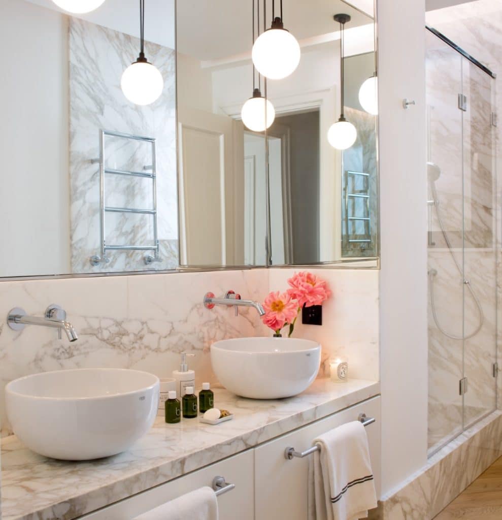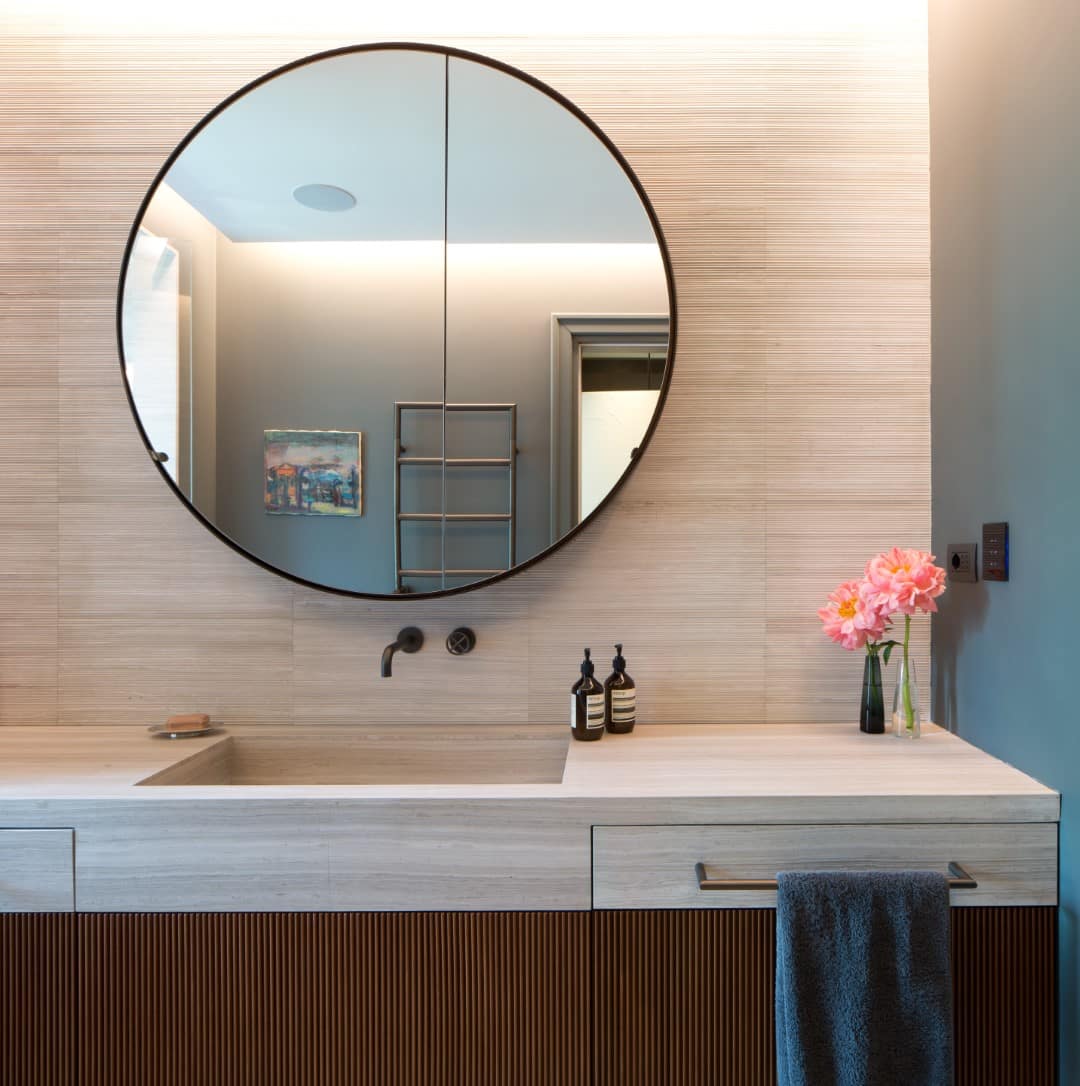 Veliko okroglo ogledalo v kopalnici odseva temno keramiko na stenah in leseno površino, na kateri je umivalnik. V drugi kopalnici pa so spretno kombinirani veliko kvadratno ogledalo, lesena vrata in kamnit umivalnik, kar ustvarja kontekst miru in spokojnosti.