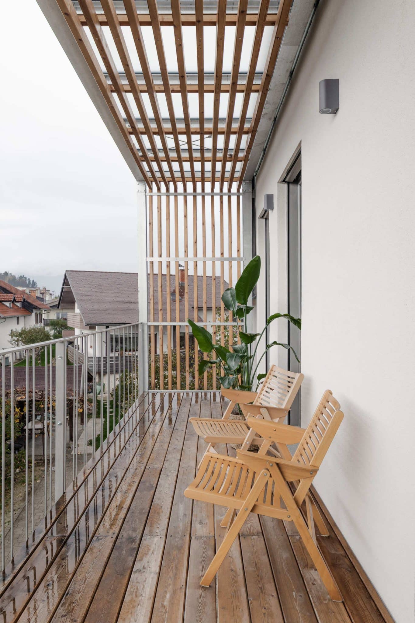 Čeprav je bila hiša dobro vzdrževana in že večkrat osvežena, so ji z zadnjo prenovo poskušali dati enoten izgled. Zato so zamenjali vsa okna, obnovili so fasadni ovoj, preuredili del ostrešja in zamenjali strešno kritino. Dodali so kovinsko konstrukcijo z dvema balkonoma, ki sta oblikovana kot skladen element z leseno opno. S tem so dosegli, da se bivanje v mansardi lahko podaljša tudi v zunanji prostor.
