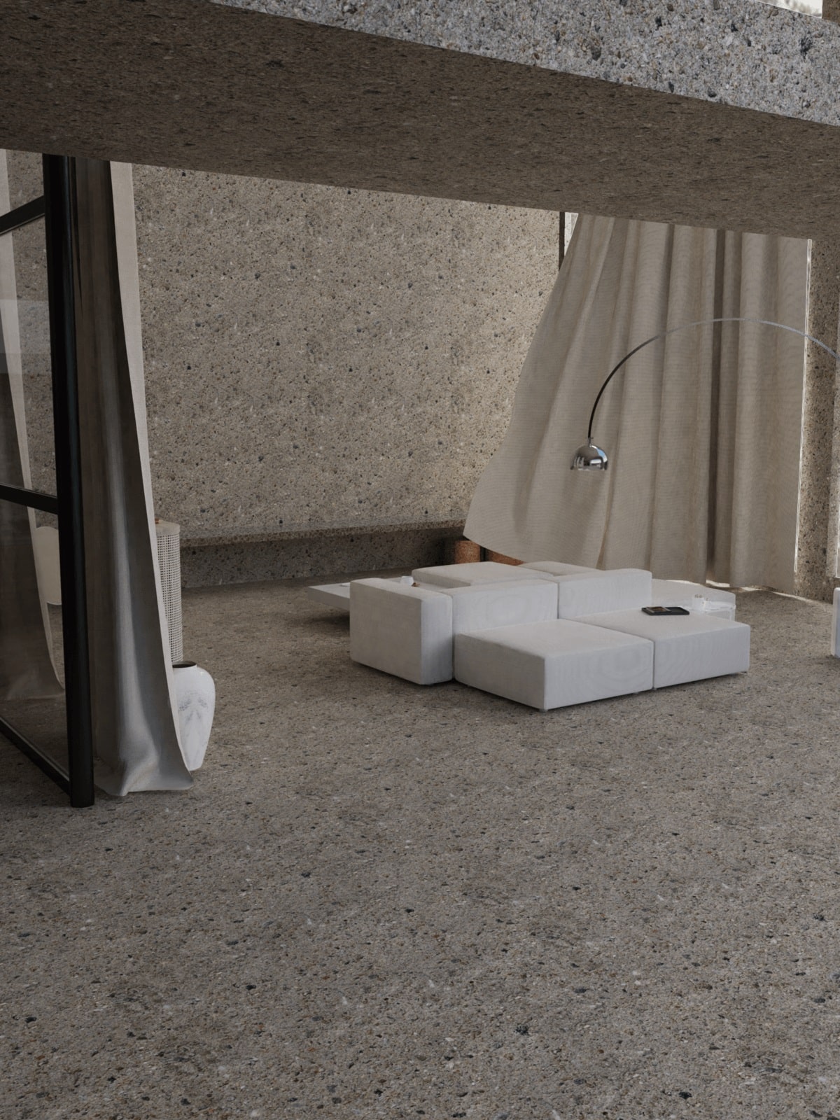 V stanovanju ni veliko pohištva, vsak kos pa je natančno izbran tako, da bi zadovoljil čute in potrebe umetnice, kateri je namenjen. V dnevni sobi, ometani v rjavi betonski omet, tako kraljuje Mags sofa studia HAY design (za počitek), ki ji družbo delajo Bang & Olufsenov zvočnik Beoplay A9 (za poslušanje glasbe) ter Flosova svetila (za branje). V jedilnici so okoli mize zbrani Pierre Jeanneret Chandigarh stoli (za počasno obedovanje), mizo pa osvetljujejo svetila z organsko oblikovanimi keramičnimi senčniki. V spalnici poleg minimalistično zasnovane postelje najdemo še Dysonov vlažilec zraka (za popolno ugodje), ki je oblikovalko pritegnil s svojim futurističnim izgledom. “Kose sem izbirala povsem intuitivno. Po pregledu dela in življenja Björk sem si nekako ustvarila predstavo, kakšen prostor za počitek bi ji namenila.”