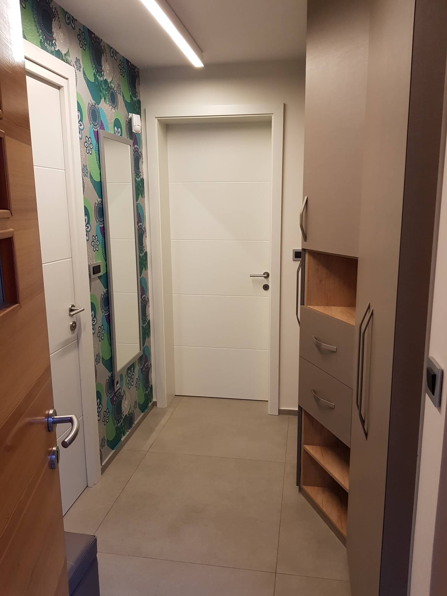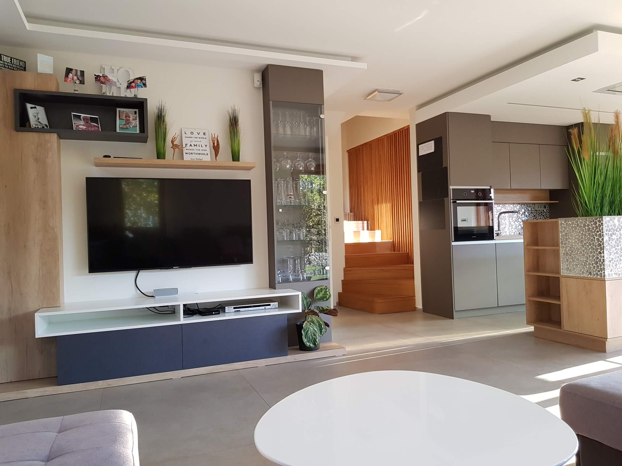 »Ko smo prvič prišli na ogled hiše, sta Domen in Tina začela naštevati ta svoj neskončno dolg seznam, kaj vse si želita. In sem ju najprej vprašala, če sta slučajno kupila obe enoti dvojčka. Ker teh želja je bilo res nenormalno veliko,« se spominja arhitektka Bečan. Izpolnila jima je željo po čim bolj odprtem bivalnem delu, kuhinjskem otoku, veliki sedežni garnituri in jedilni mizi za 8 do 10 ljudi. Za kuhinjsko nišo so uspeli umesiti tudi manjši kabinet, ki ga bodo lahko v prihodnosti preoblikovali v spalnico.