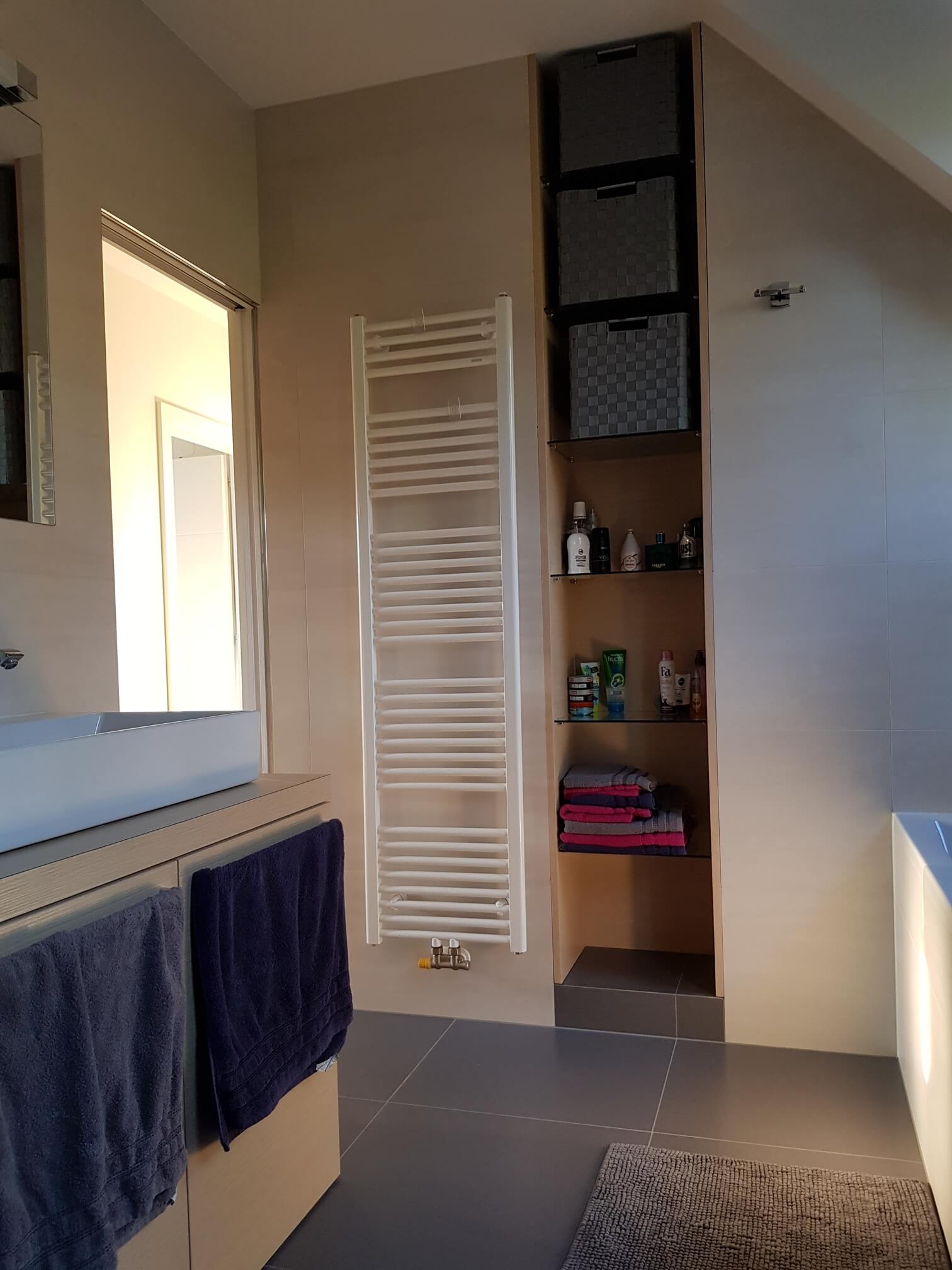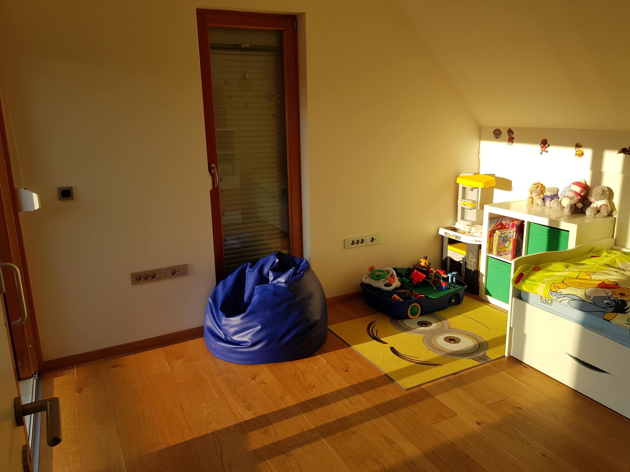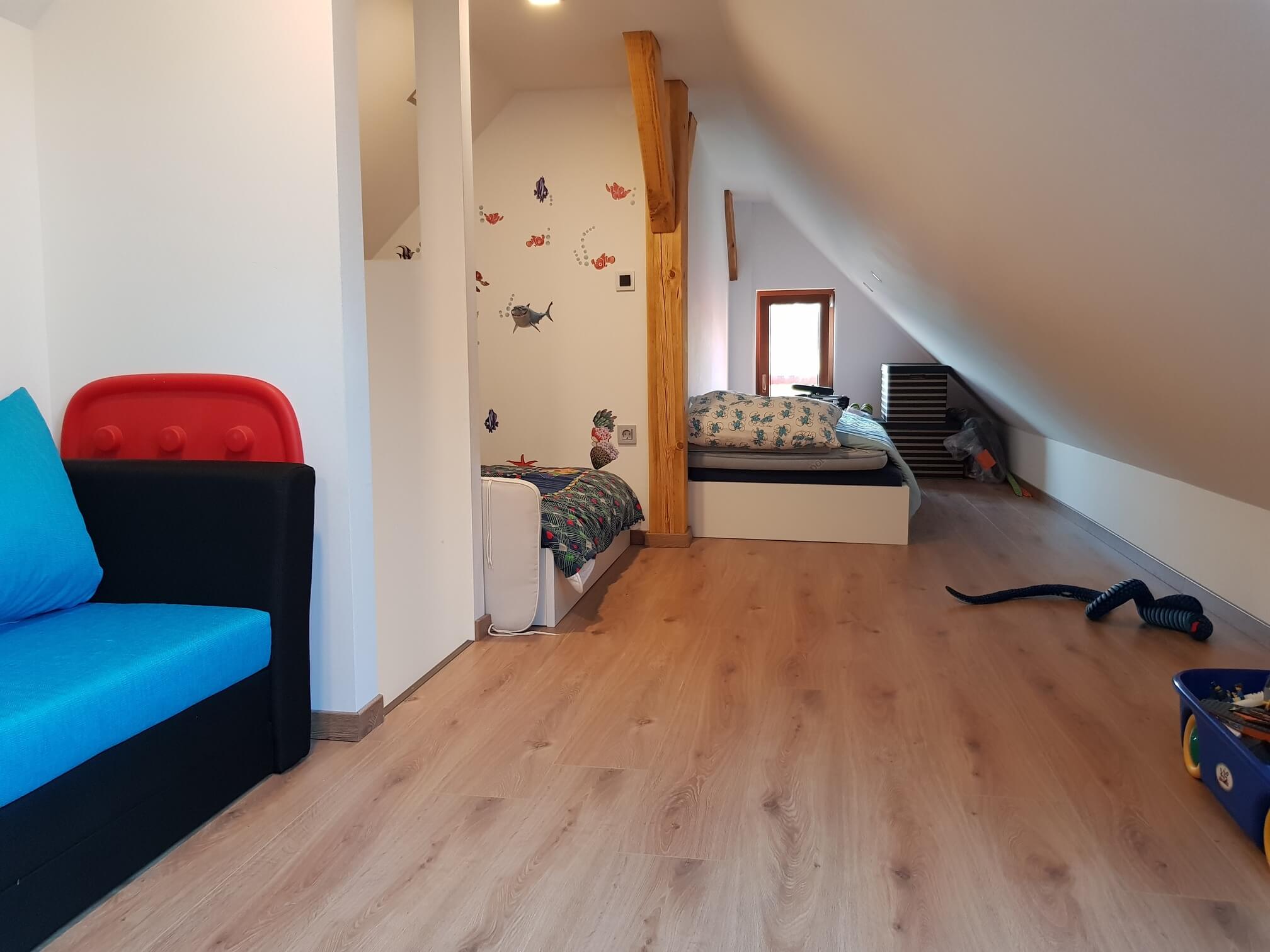 V nadstropju so uredili dovolj prostorno kopalnico s kadjo, dvema umivalnikoma in zelo praktično cevjo za umazano perilo, povezano z utilitijem spodaj. Tu je tudi garderobna soba, spalnica staršev in pa soba za najstarejšega sina, medtem ko imata srednja sinova dvoetažno sobo tik pod streho, kjer je pravi mali otroški raj.