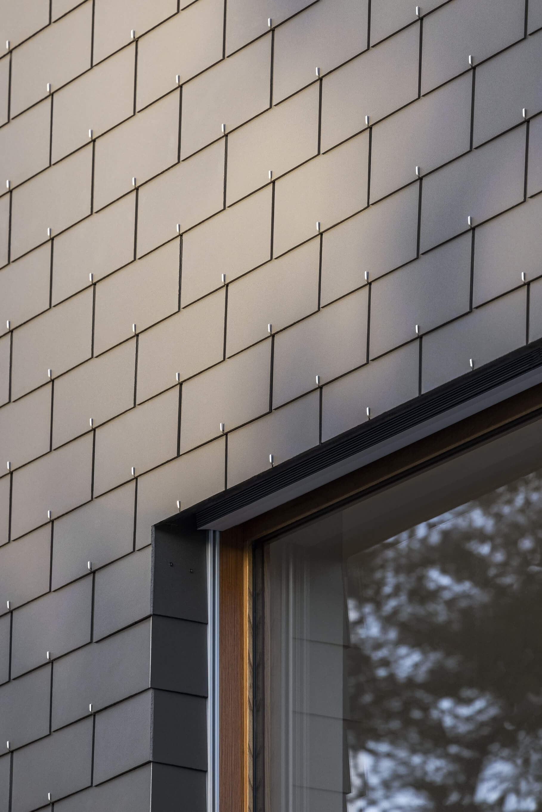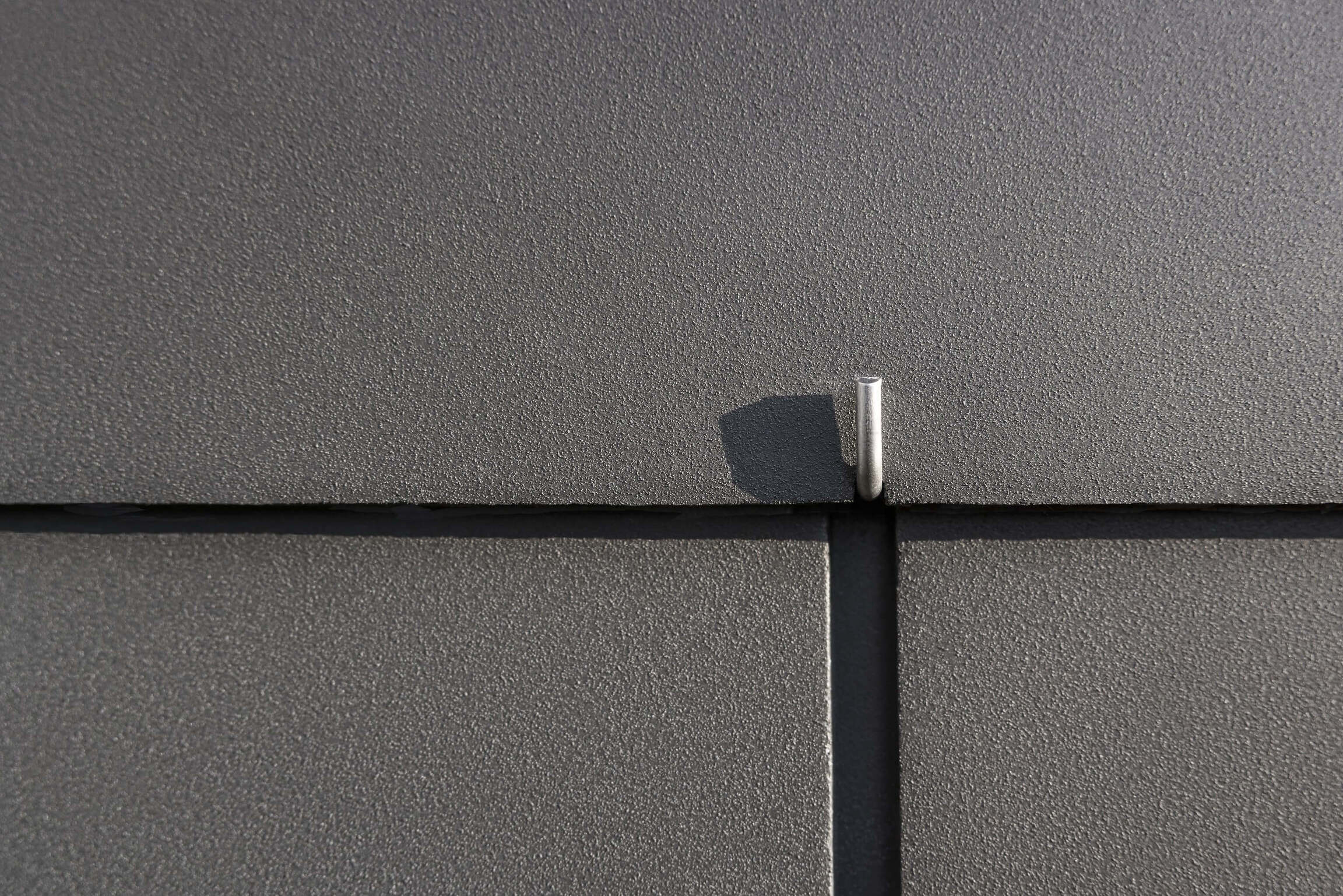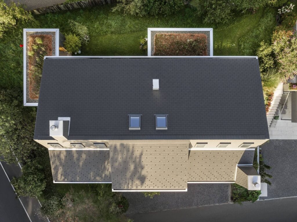 Dvostanovanjska hiša se navzven izraža kot kompaktna in atmosferska celota, katere temna, skoraj monolitna kubatura takoj pritegne pogled. Ključni element prenove je popolna zunanja ovojnica iz vlaknocementnega fasadnega materiala Swisspearl Natura, ki enotno povezuje fasado in streho ter objektu daje jasno, sodobno podobo. Zaradi svoje odpornosti, negorljivosti in dolge življenjske dobe so vlaknocementni izdelki zanesljiva rešitev za sodobno arhitekturo. Minimalno vzdrževanje, trajnostna sestava iz naravnih surovin ter možnost uporabe na fasadi in strehi omogočajo celosten pristop k oblikovanju, kjer material ne dopolnjuje arhitekture, temveč jo soustvarja.