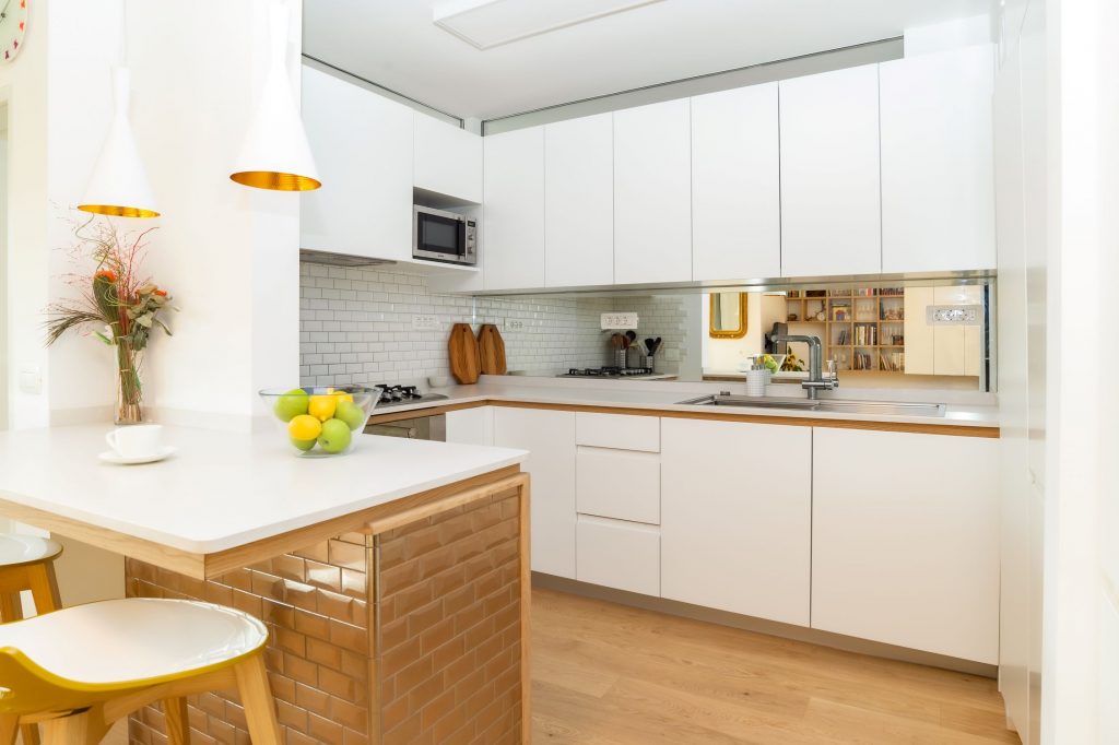 Kuhinja, po novem umaknjena v nišo, dobiva naravno svetlobo preko dnevne sobe in skozi stekleno steno v spalnici. Arhitektka je pazljivo izbrala tudi materiale, da bi bila kuhinja kljub indirektni osvetlitvi svetla in prijetna. Pohištvo je belo, ploščice glazirane, del stene nad pultom pa je obložen z ogledalom. Kuhinja se delno podaljša tudi v bivalni prostor – tako z visokim nizom kot z majhnim zajtrkovalnim kotičkom, ki kot polotok hkrati deli in združuje dnevno sobo, jedilnico in kuhinjo.