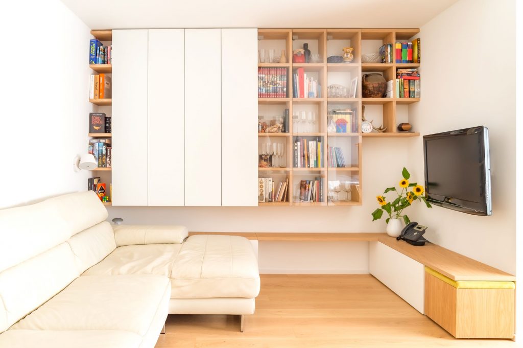 Oprema v dnevni sobi se je prilagodila velikosti obstoječega kavča. Tako je tik ob kavču nizka polička za odlaganje daljinskih upravljalnikov, časopisa ali kave, nad njo pa še velika, v mreži zasnovana omara, ki z odprtimi in zaprtimi shranjevalnimi površinami v prostor vnese tako dinamiko kot red. Okrogla, raztegljiva jedilna miza zavzema malo prostora: umeščena pa je na najsvetlejši in najprijetnejši del stanovanja, tik ob balkonsko ložo.