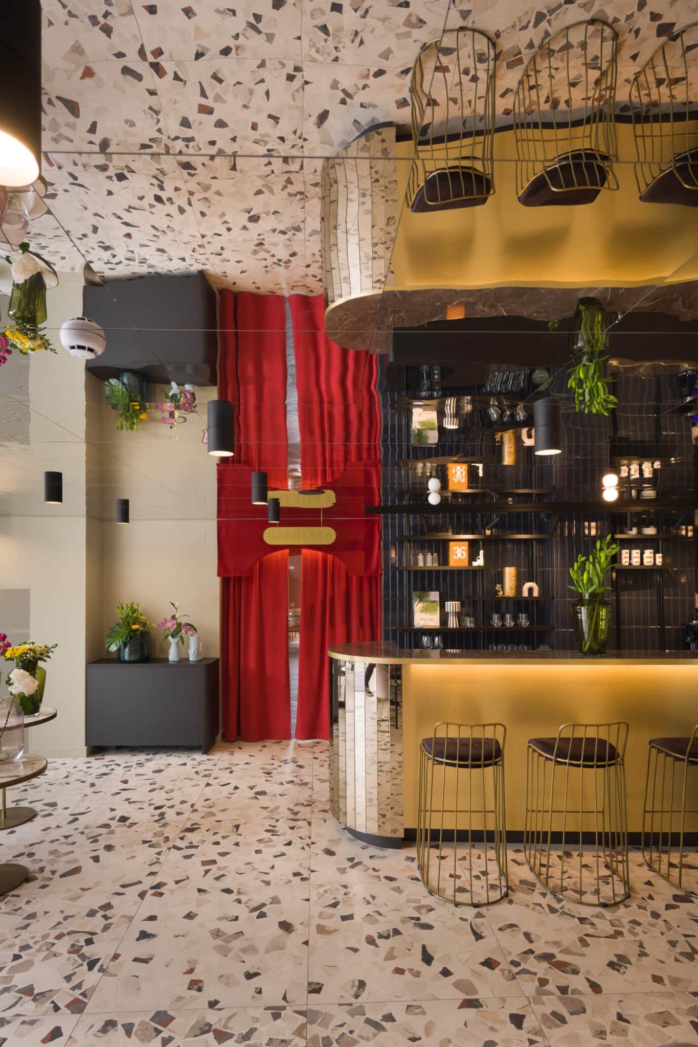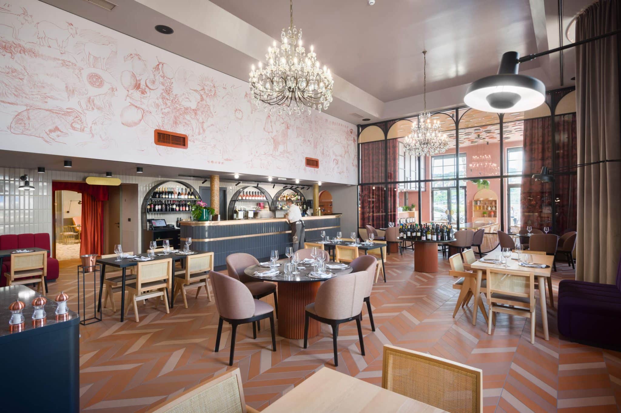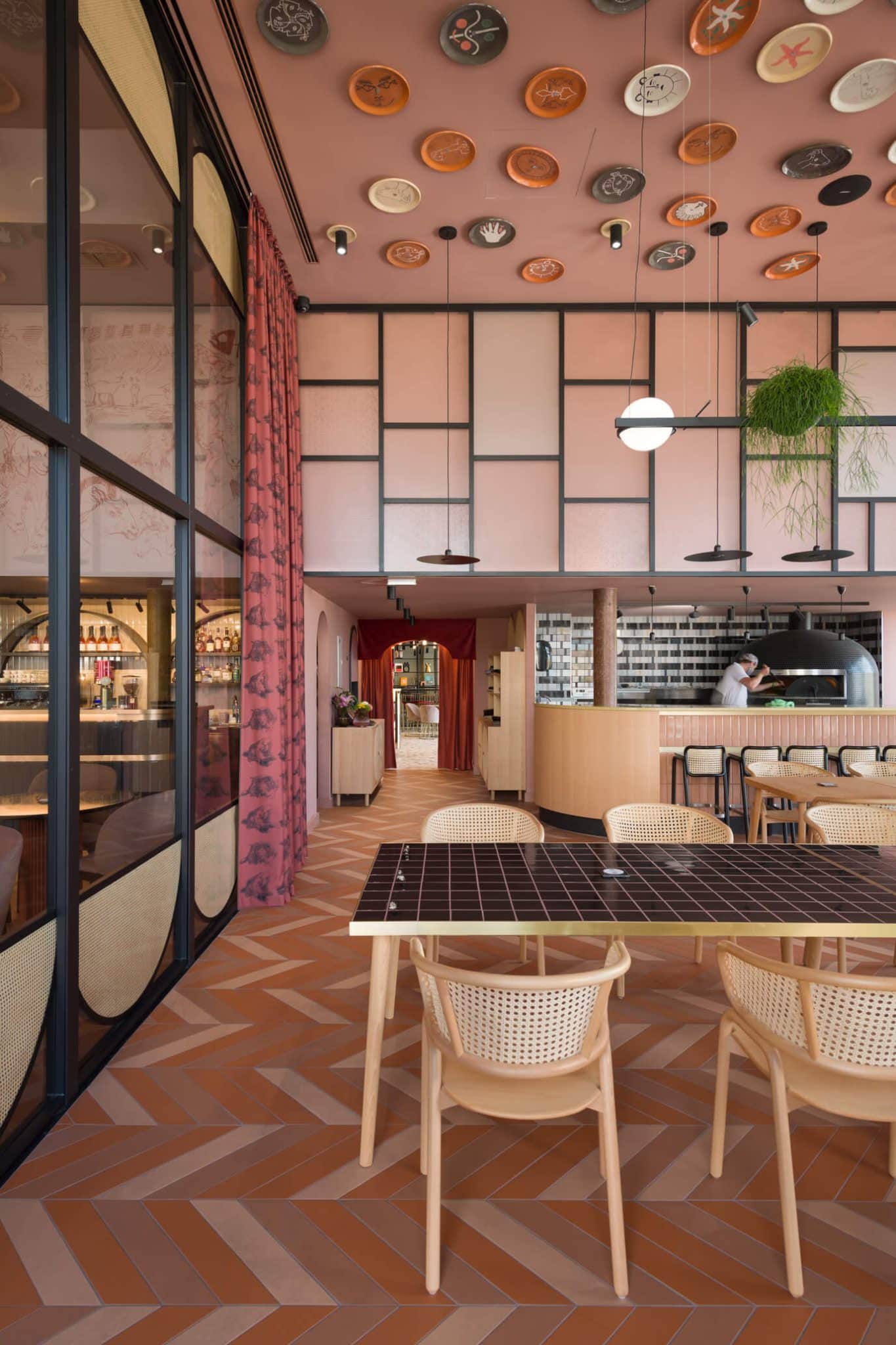 Na tem mestu se tako prepleta sodobni oblikovni izraz s klasičnimi materiali, ki jih lahko najdemo na relaciji Benetke – Dunaj: s keramičnimi ploščicami z izgledom paladijanskega teraca, teracotta ploščicami, položenimi v ribjo kost, z ogledali obloženim stropom lobby-ja, velikimi lestenci v zlatih odtenkih, umetelno zasnovano stekleno predelno steno … Vsi ti elementi pa se prepletajo še z izvirno grafično podobo, ki nad prostorom izrazito dominira: z veliko ilustrirano tapiserijo v restavraciji, z ročno poslikanimi keramičnimi krožniki, pritrjenimi na strop picerije, ali pa z zaveso, prav tako izdelano prav za ta projekt in potiskano z izvirno ilustracijo kozjih glav.