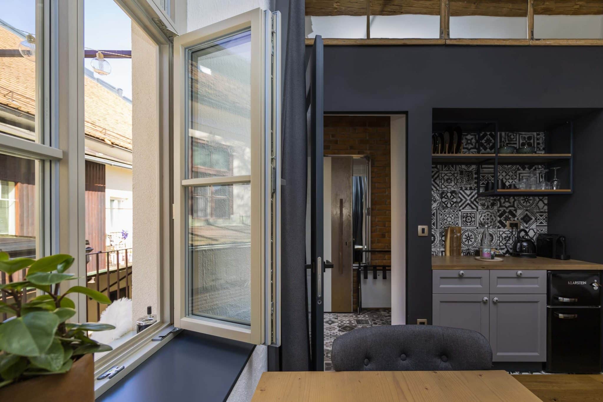 Za osnovne gradbene elemente, kot je stavbno pohištvo (okna, vrata) sta zahtevala brezpogojno kakovost tako po tehnični kot oblikovalski plati. Ker je imelo prvotno staromeščansko stanovanje lesena okna in sta želela ohraniti ta duh meščanskega stanovanja, sta se pri prenovi odločila kar se da slediti tej logiki. Lesena okna s svojo naravno strukturo, značilnim vonjem in videzom, so bila edina možna izbira.