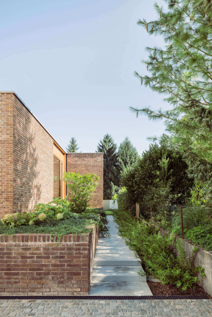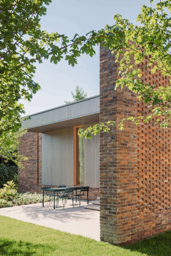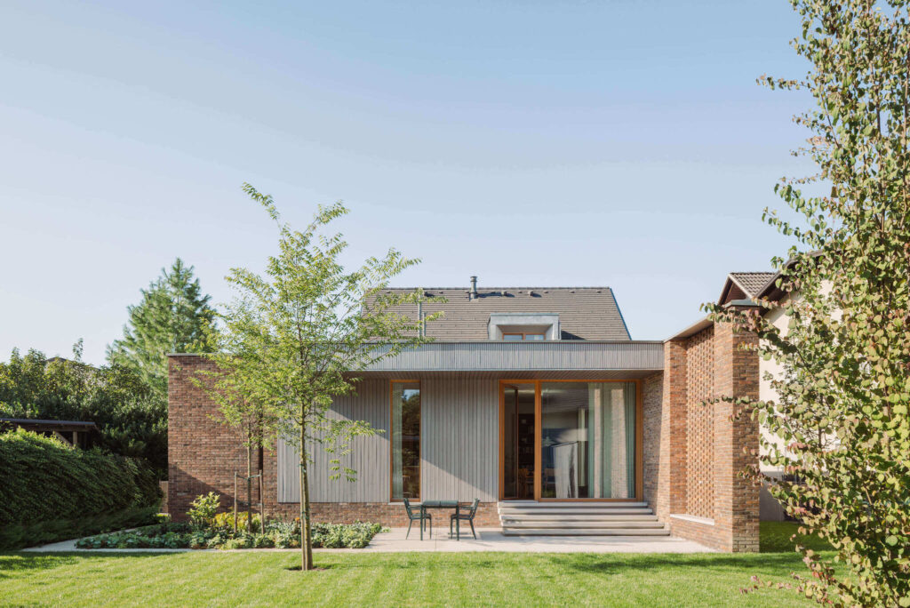 Opečni prizidek je pritličen in v celoti podrejen formatu izbrane opeke, ki postane osnovni konstrukcijski in oblikovni modul. Zidovi se podaljšujejo v vrt in brišejo jasno mejo med notranjim in zunanjim prostorom. Na mestih prekinitev zidov se pogledi, svetloba in prostori prepletajo, bivalni prostor pa se naravno razširi tudi na zunanjo teraso.