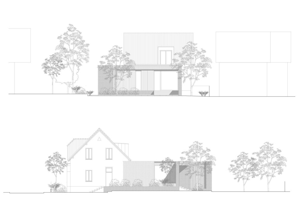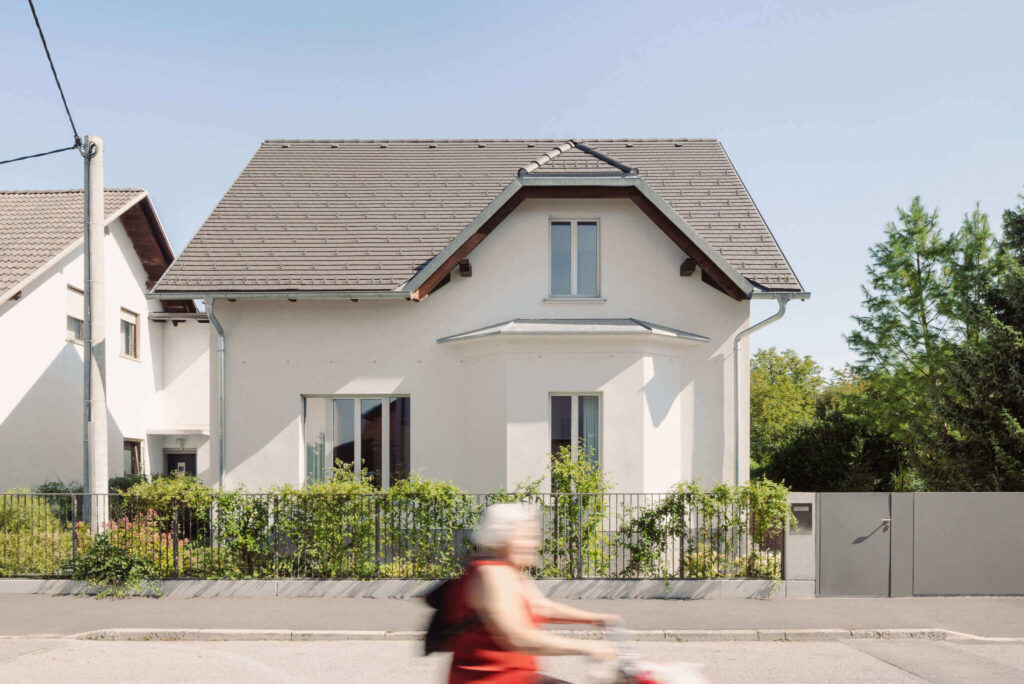 Zunanja podoba obstoječe hiše je bila oblikovno posodobljena z večjimi okni, nižjimi parapeti in tenkimi profili stavbnega pohištva. Nova okna ne posnemajo historičnega izvirnika, temveč iščejo sodoben, a zadržan izraz. Ulična fasada ostaja mirna in vpeta v niz sosednjih hiš, vrtna stran pa s sodobno opečno arhitekturo jasno razkrije, da gre za poseg našega časa. Hiša ima danes dva obraza – starega in novega – a deluje kot enovita celota. Med njima ne gre za tekmovanje, temveč za dialog med različnima obdobjema.