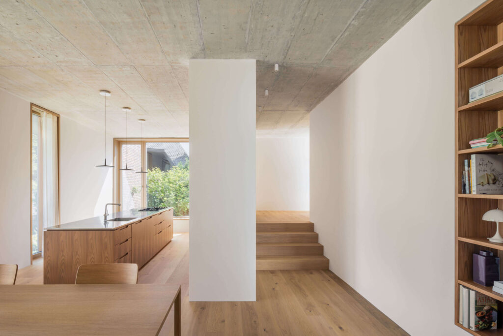 Materialna podoba je zadržana, a izrazna. Beton, les, steklo in bele stene ustvarjajo umirjeno ozadje, v katerem pridejo do izraza svetloba, prostorski prehodi in pogledi navzven. Kuhinja, jedilnica in dnevni prostor so povezani v enoten ambient, ki se z velikimi zasteklitvami odpira proti vrtu. V nadstropju so spalni prostori z izhodom na strešno teraso, od koder se pogled znova odpira v zelenje Rožne doline.