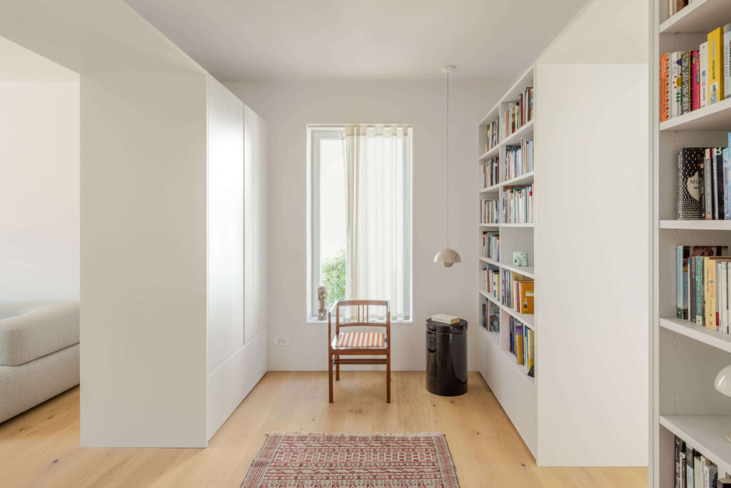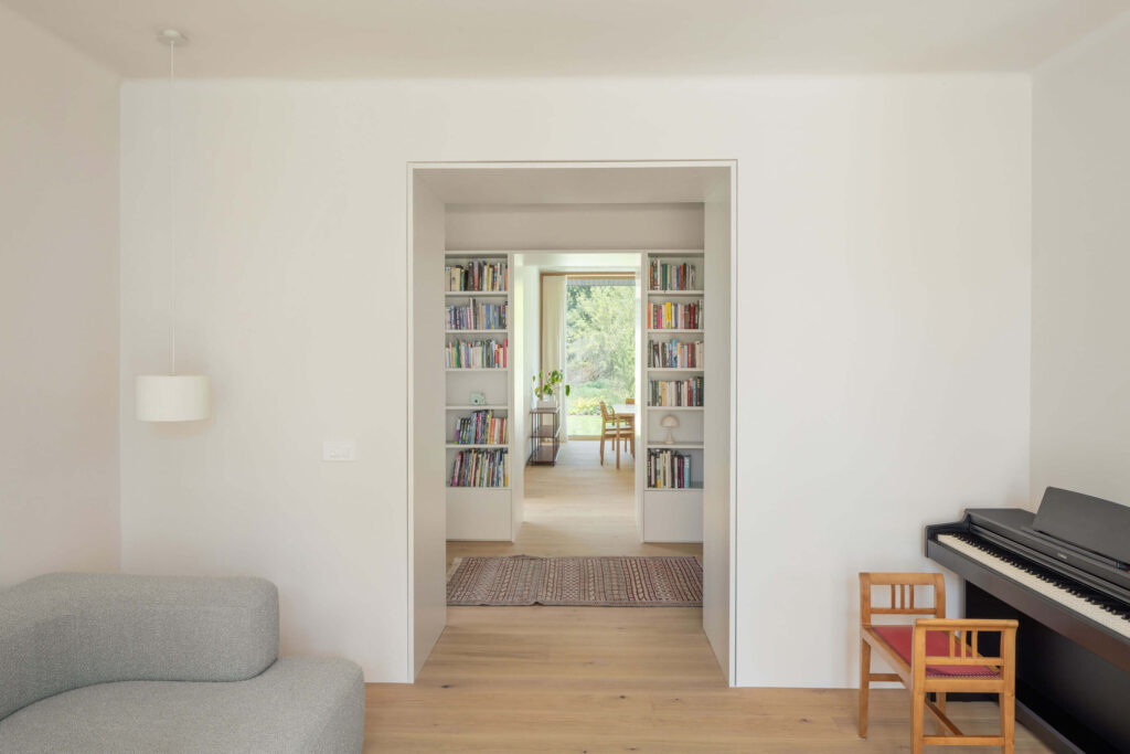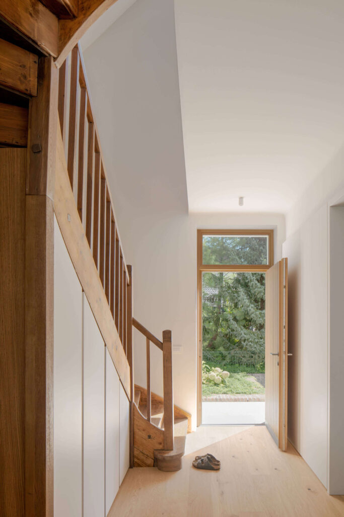 V interjerju se prepletata staro in novo. Leseno stopnišče, eden redkih ohranjenih avtentičnih elementov stare hiše, ostaja pomemben nosilec prostorske identitete in spomina. V pritličju se prostori nizajo drug v drugega: od delovnega kabineta in prehodne knjižnice do osrednjega bivalnega prostora v prizidku.