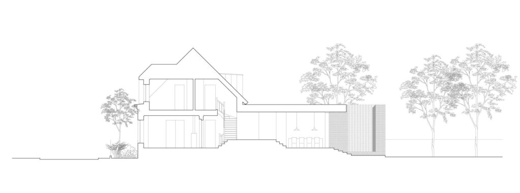 V obstoječi hiši so v pritličju razporejeni dnevni prostori, v nadstropju pa spalnice. Bistveni prostorski preobrat pa prinese nov opečni prizidek na severni strani, s katerim se parter razširi proti vrtu. Novi del ni zamišljen zgolj kot funkcionalna razširitev, temveč kot prostor, ki hišo postopno odpre navzven in ji vrne tisto, kar je prvotna zadružna zasnova vedno že imela – neposreden stik z zelenjem.